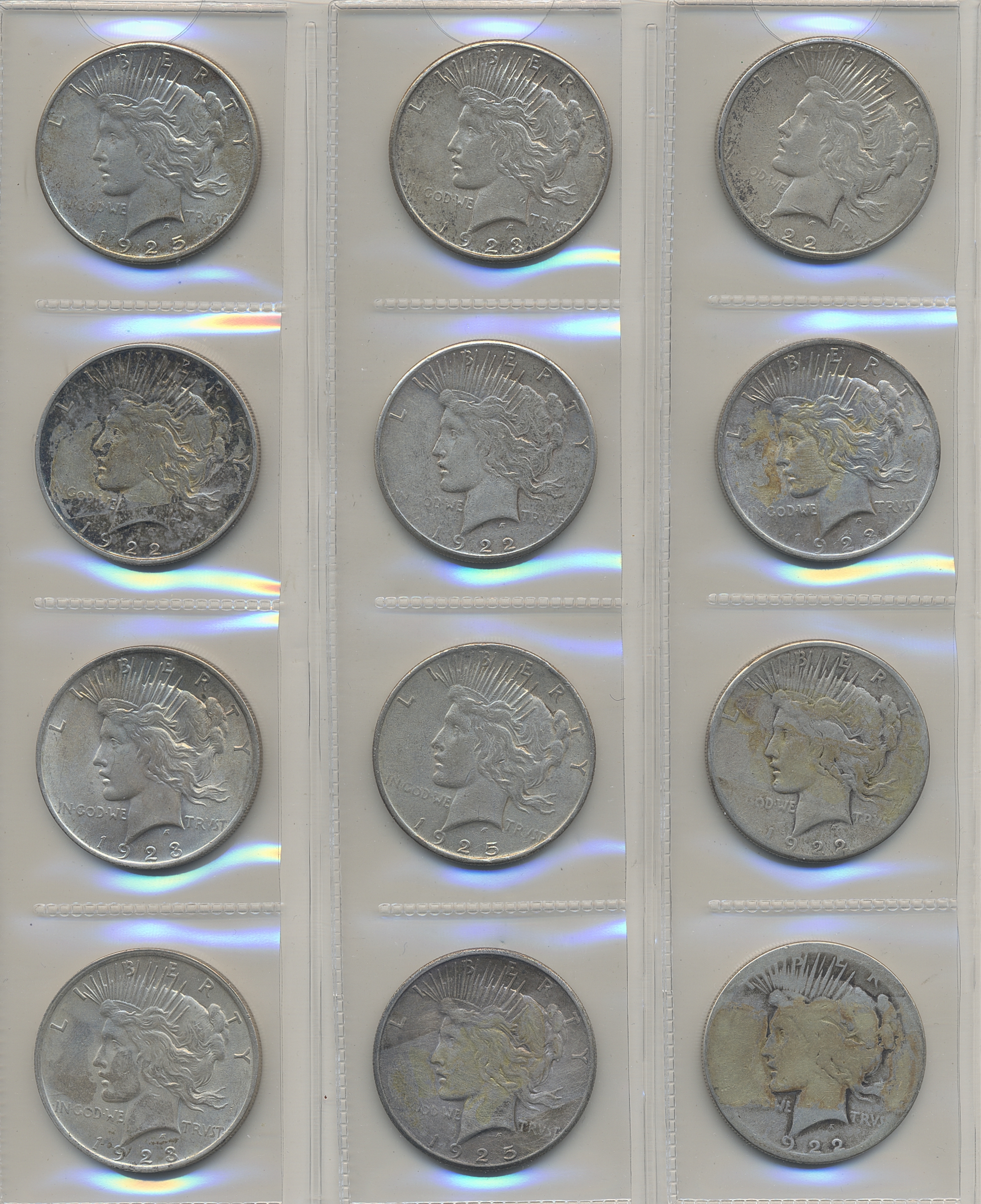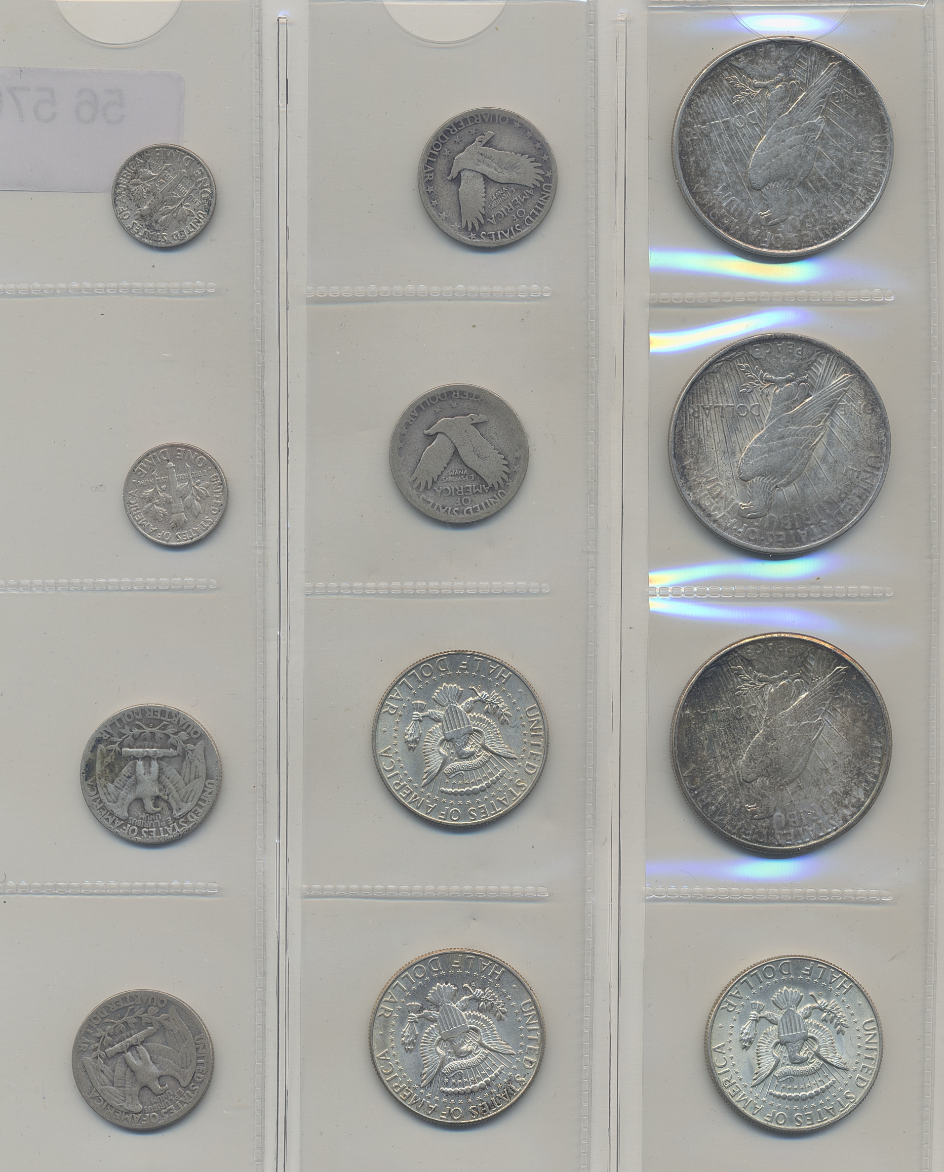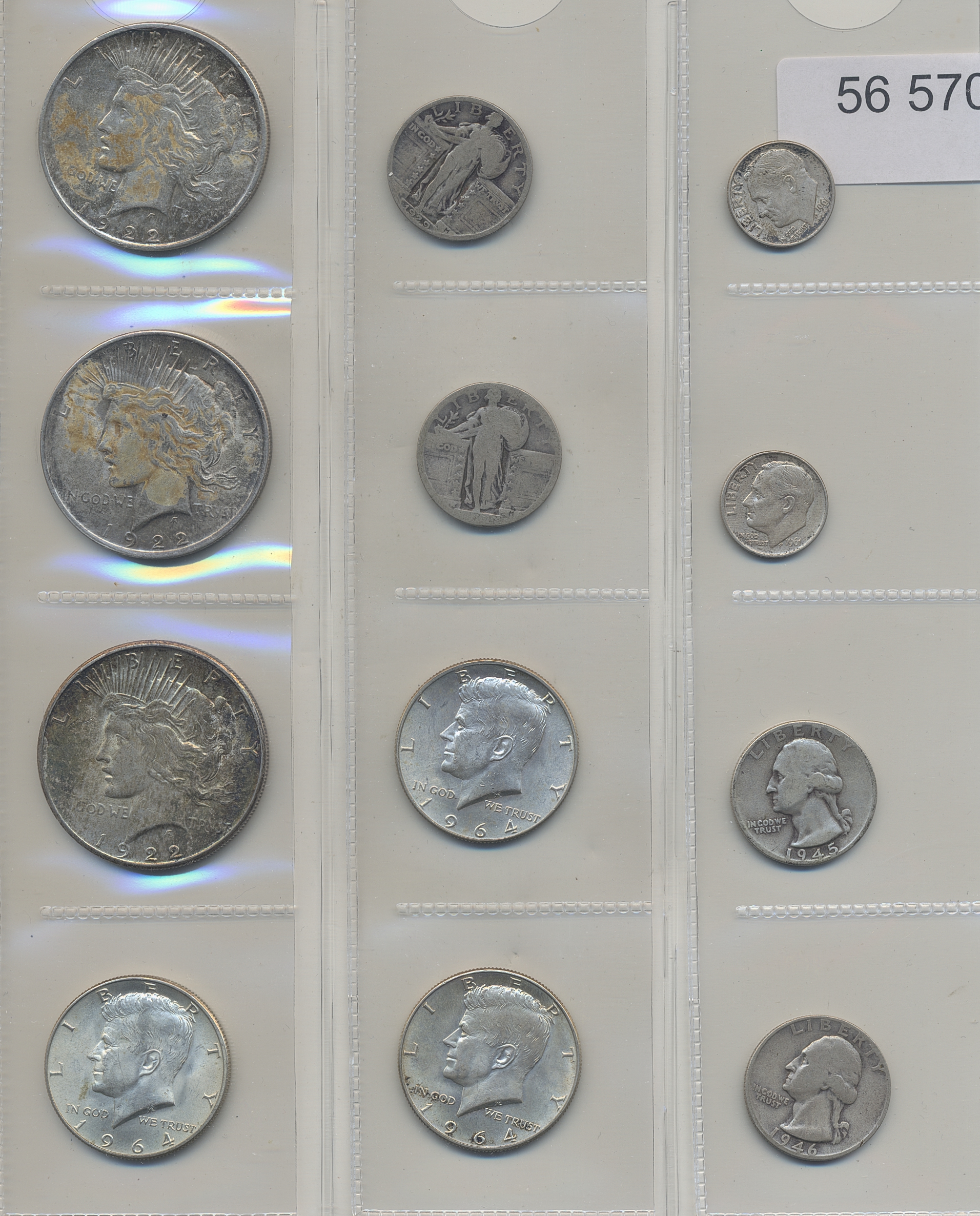 Coins, U.S.A. Lot of 23 peace dollars, three Kennedy halves 1964, four quaters and two dimes. Please inspect! VG-XF/UNC.