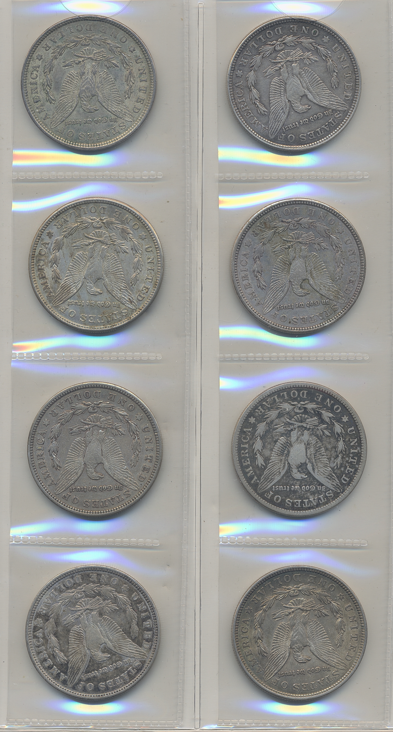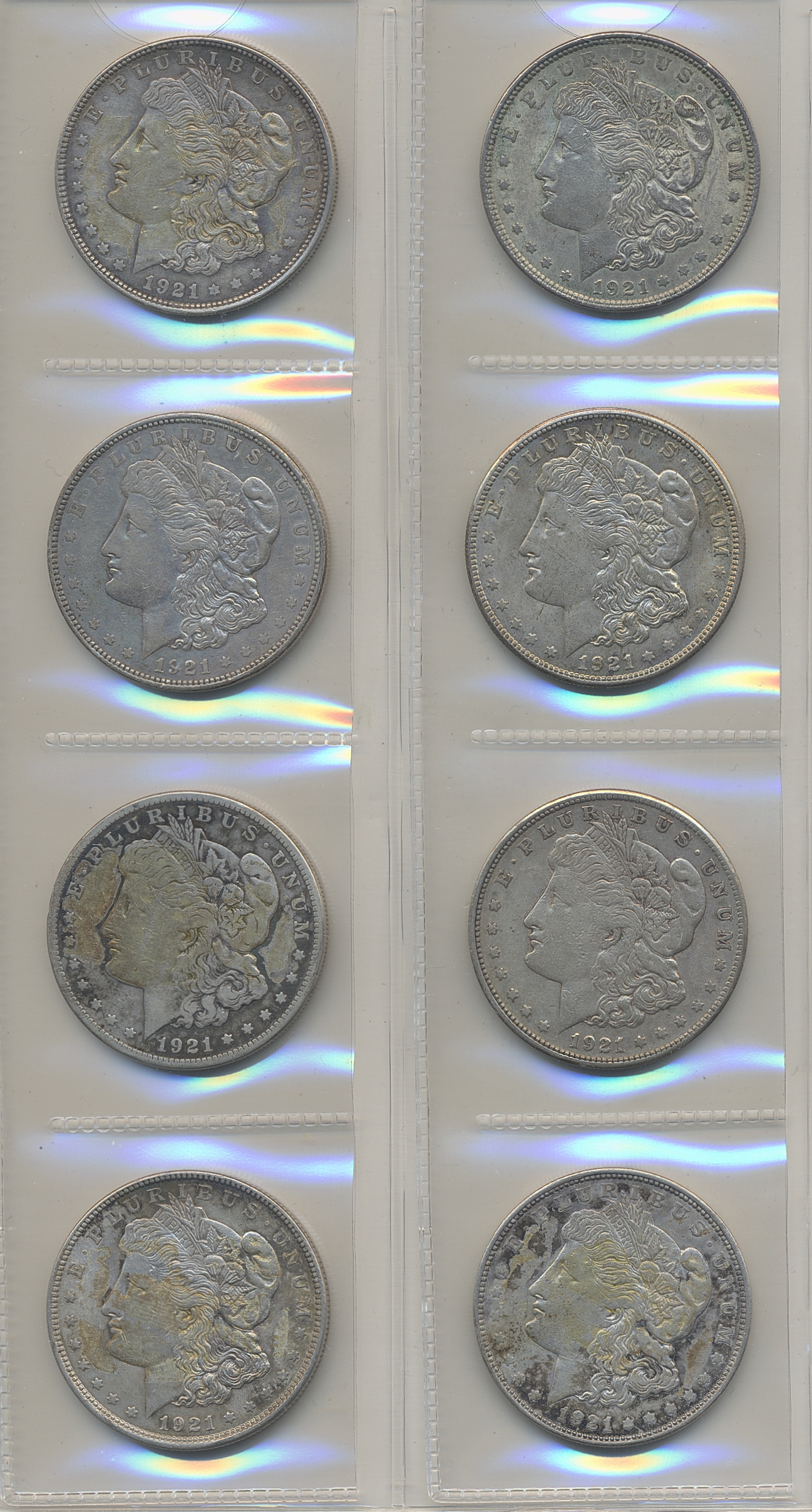 Coins, U.S.A. KM 150, Lot of eight morgan dollars 1921 with mixed mint marks (S, D and without mint mark). Mixed condition. F-XF/UNC.