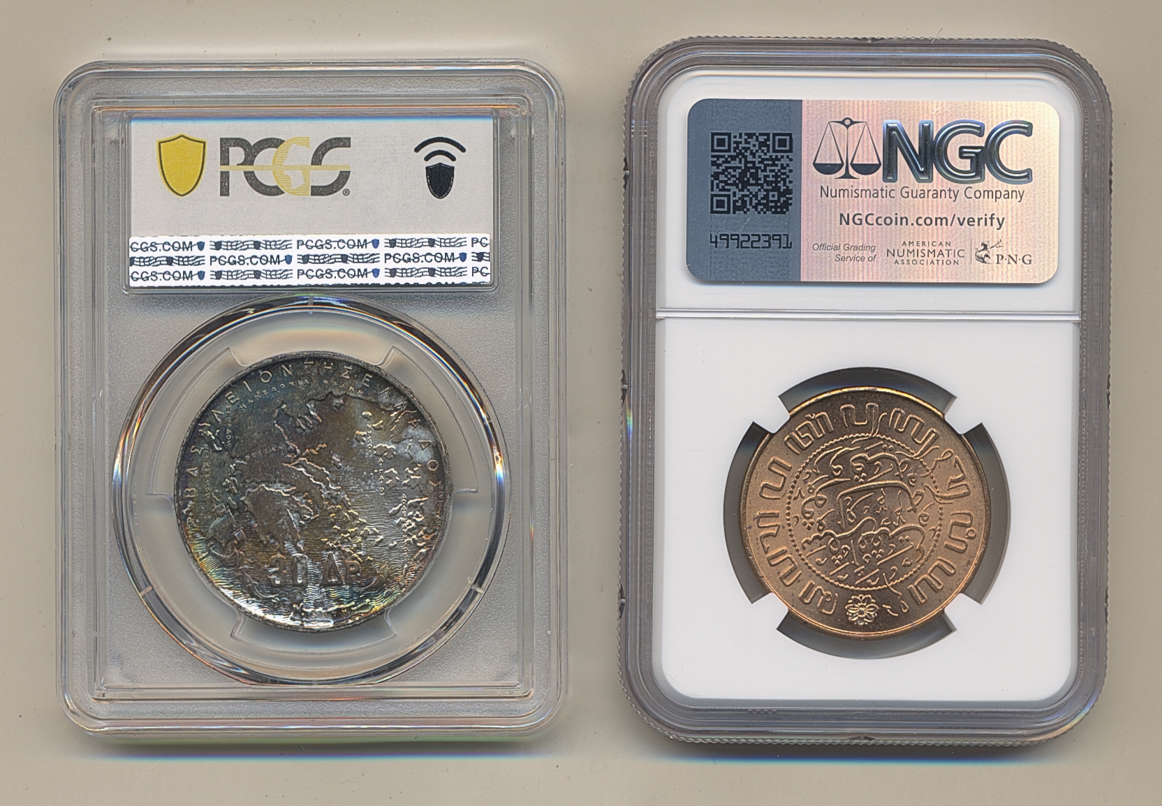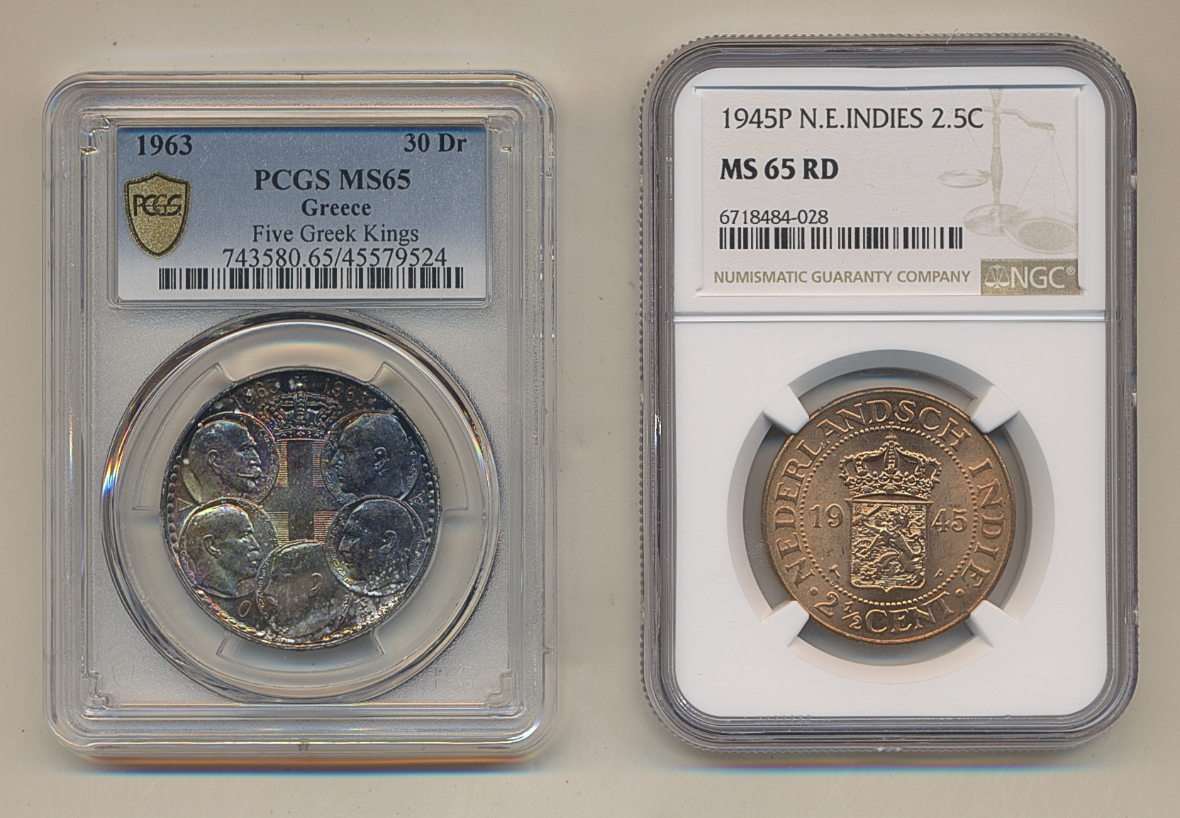 Coins, ALL WORLD. two coins: 30 drachm 1963 in PCGS as MS65 and 2.5 cent Netherlands indies 1945 P in NGC as MS 65 RD. UNC.