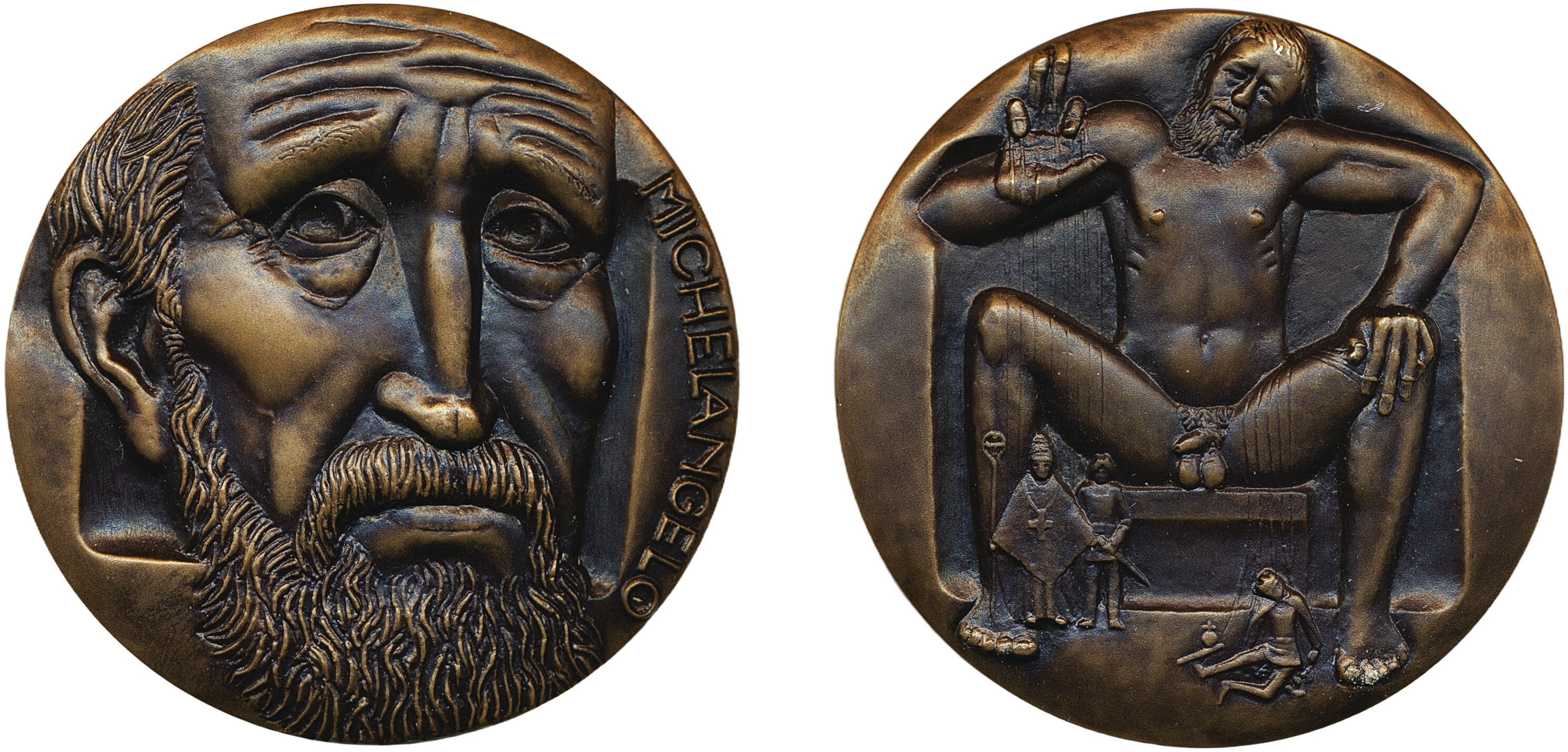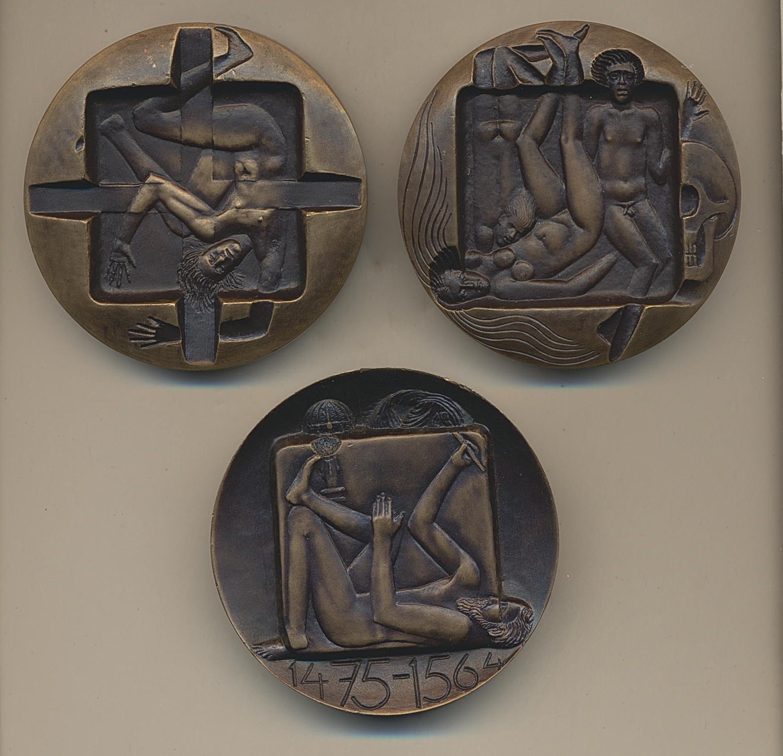 Medals, non-regal, Finland. Michelangelo. Three parts medal in bronze, 60 mm, 522 g., by K. Räsänen. In an elegant wooden case. Hackl 87. 01/0.