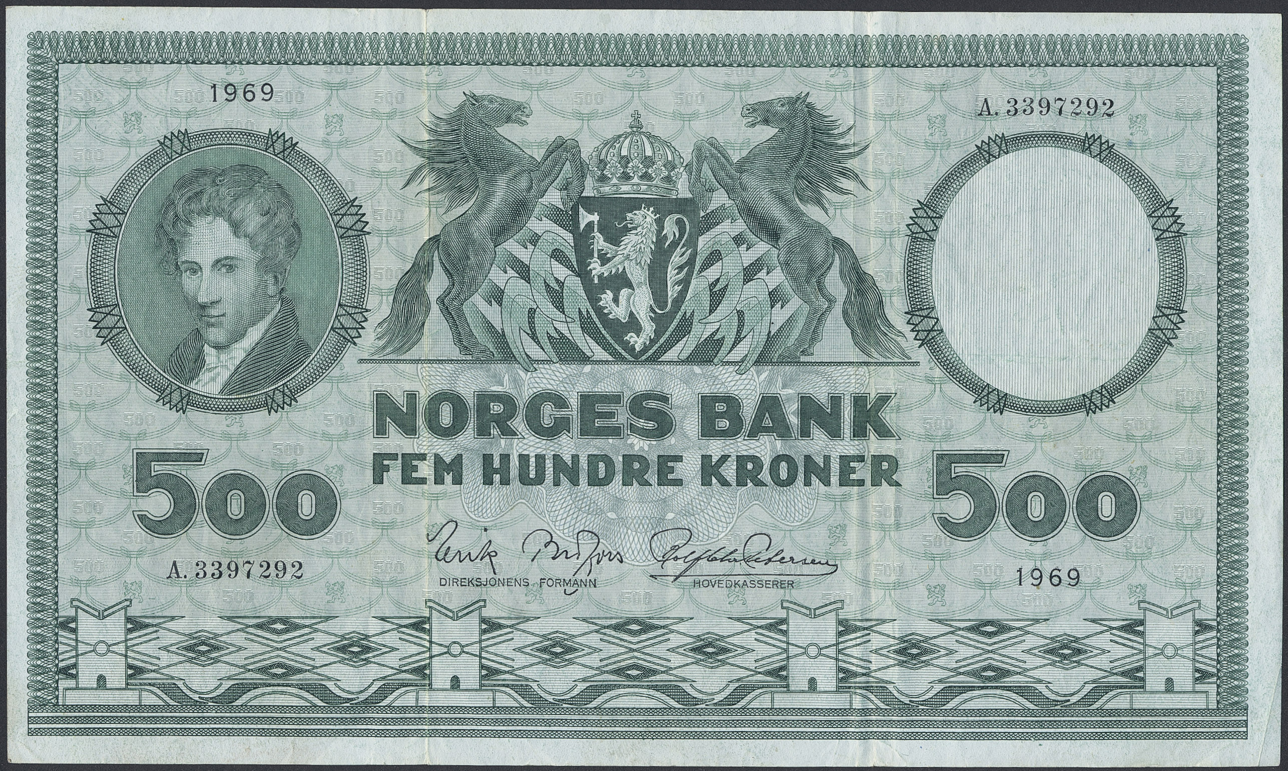 Banknotes, Norway. Pick 34d, 500 kroner 1969. A3397292. 1/1+.