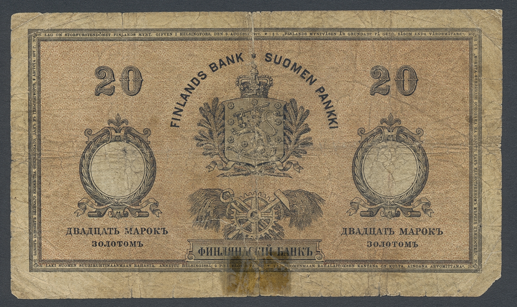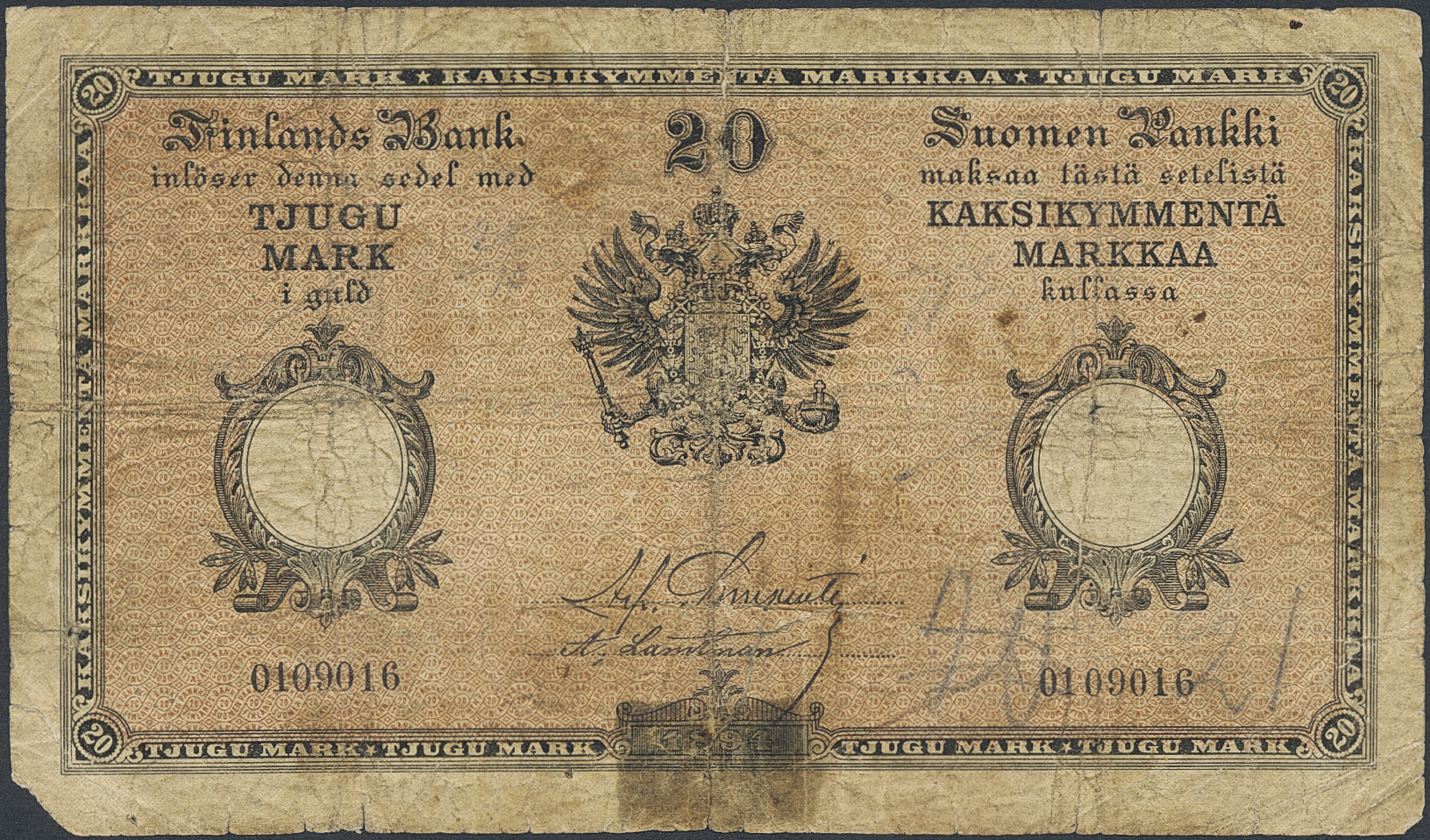 Banknotes, Finland. Pick A52, 20 markkaa 1894. No 0109016. Minor corner missing and tape damage. Tears and ink writing. 1?