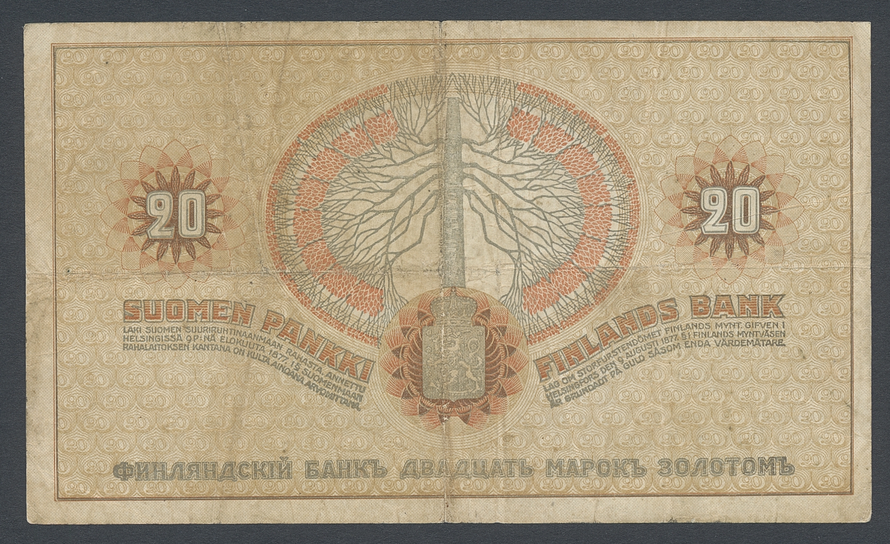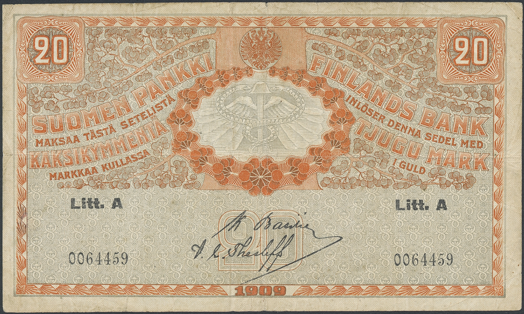Banknotes, Finland. Pick 26, 20 markkaa 1909. 0064459 Litt A. Scarce issue from Independent Finland with Litt. A. Approx. 10 recorded examples. 1?/1.
