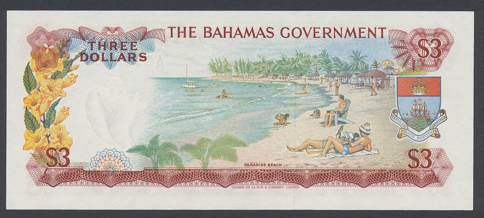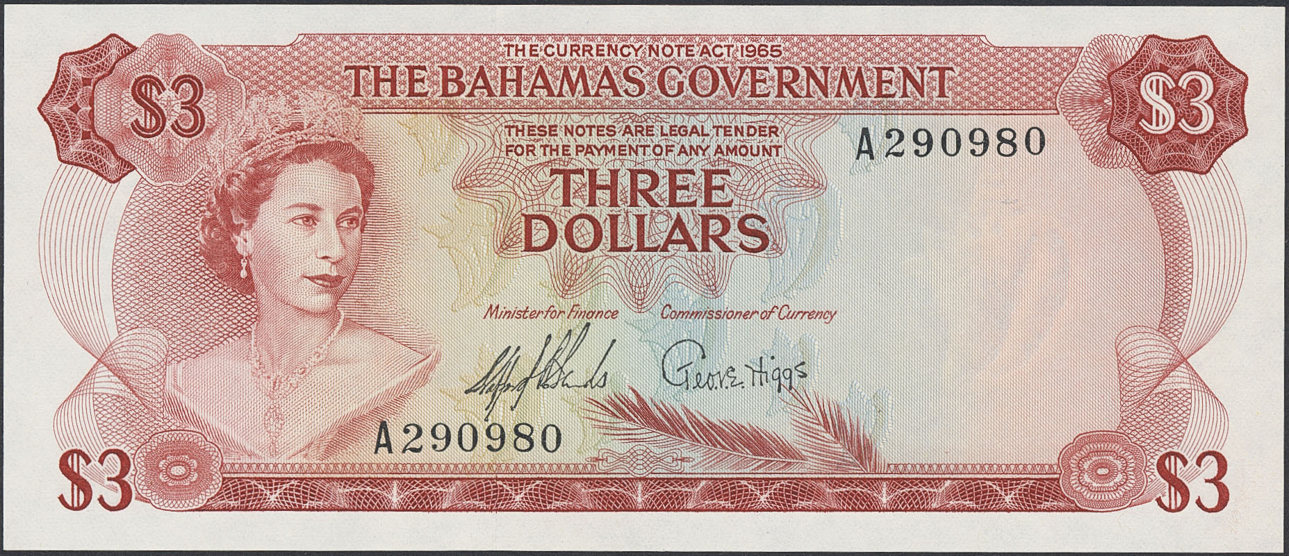 Banknotes, Bahamas. Pick 19, 3 dollars 1965. No: A 290980. UNC.