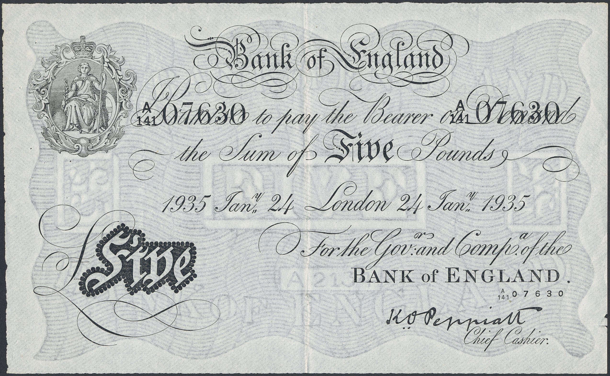 Banknotes, Great Britain. Pick 335 a, 5 pounds 1935. No: A 141 7630. F.