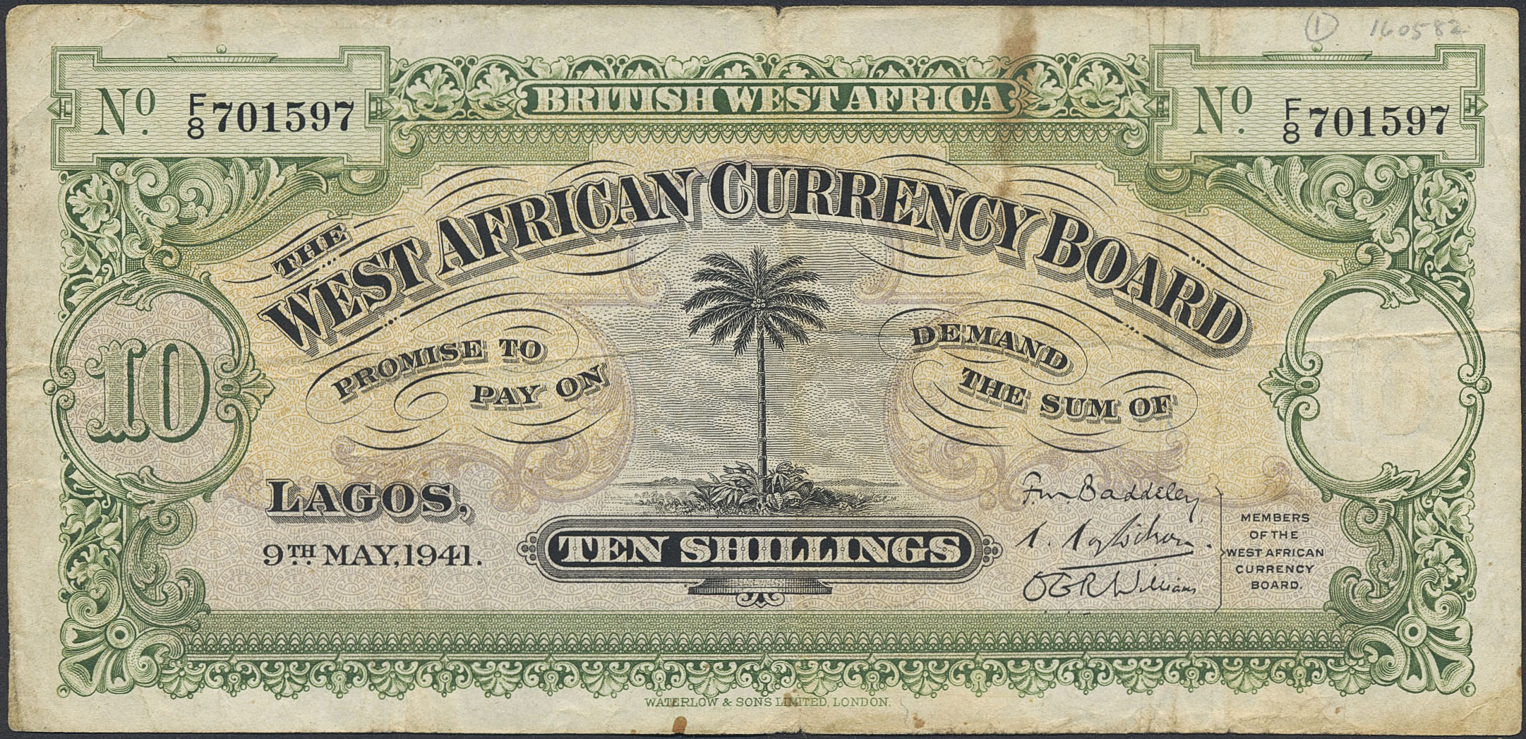 Banknotes, British West Africa. Pick 7b, 10 shillings 1941. No: F8 701597. VG.