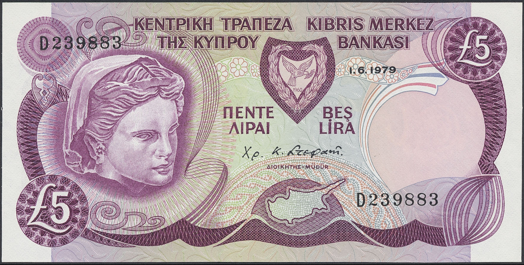 Banknotes, Cyprus. Pick 47, 5 pounds 1979. No: D 239883, 1/6 1979. UNC.