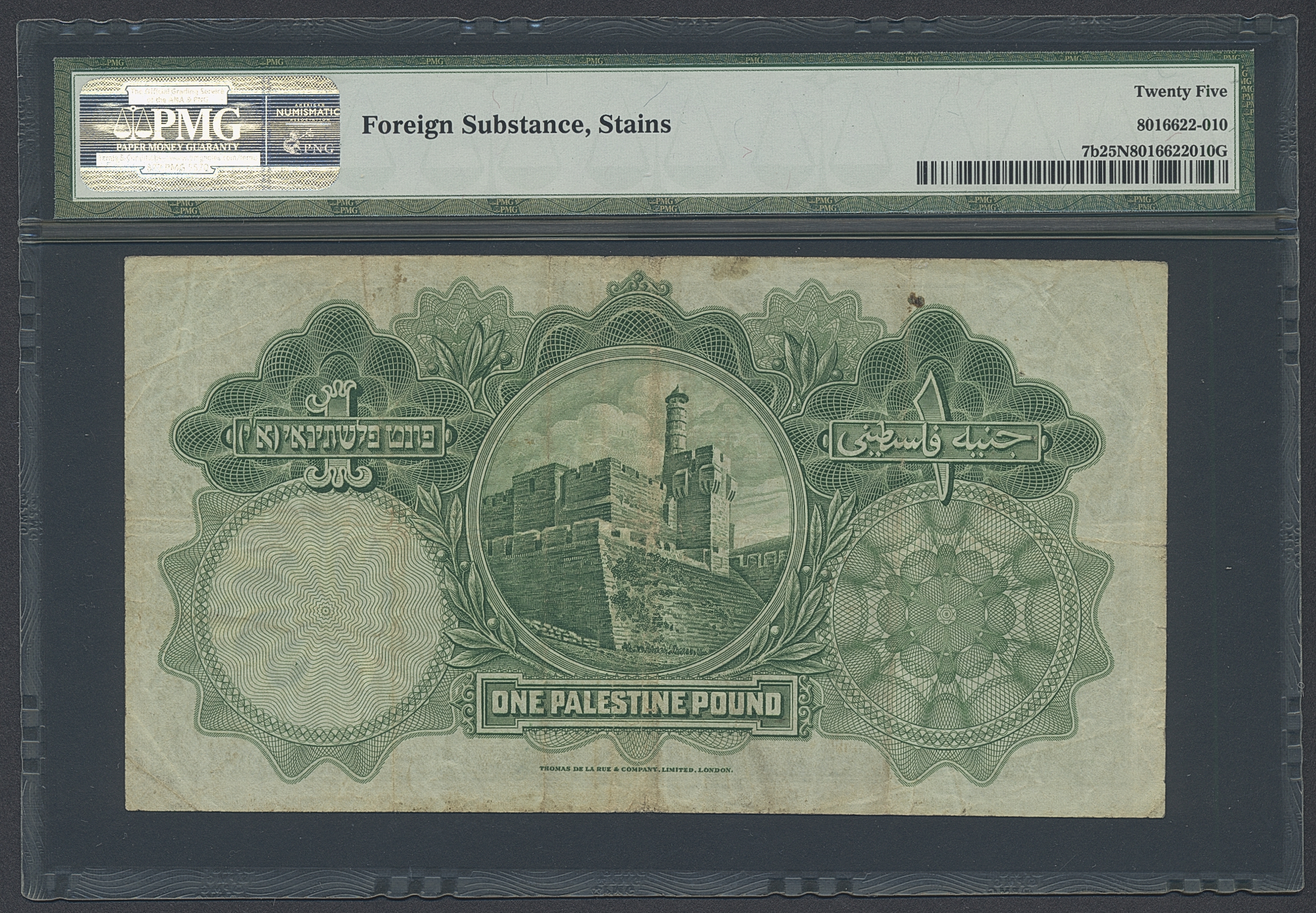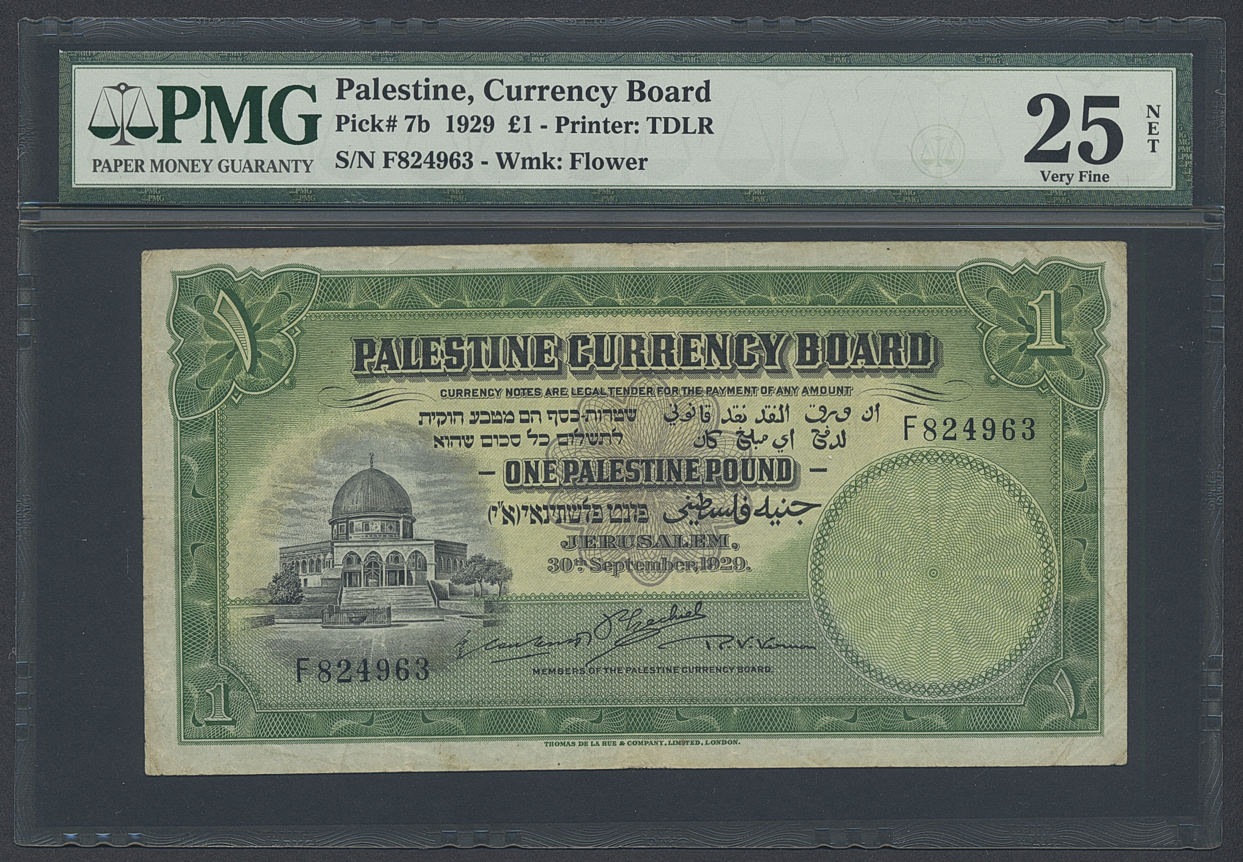 Banknotes, Ethiopia. Pick 17s2, 1 pound 1929. F824963. Graded by PMG as very fine 25 NET. (The NET would most likely no longer apply to this note as the only comments are about stains and 'foreign substance'). VF.