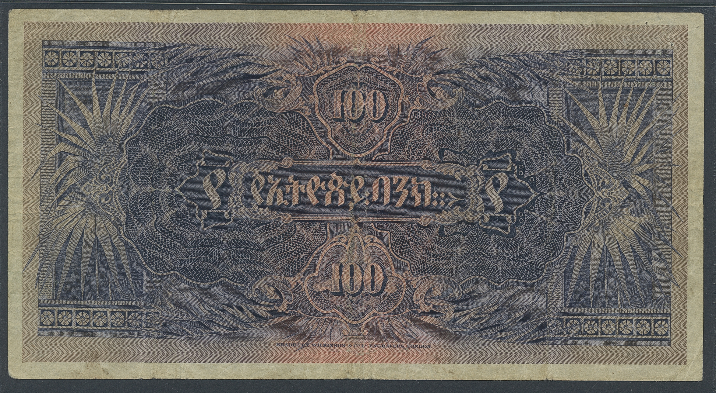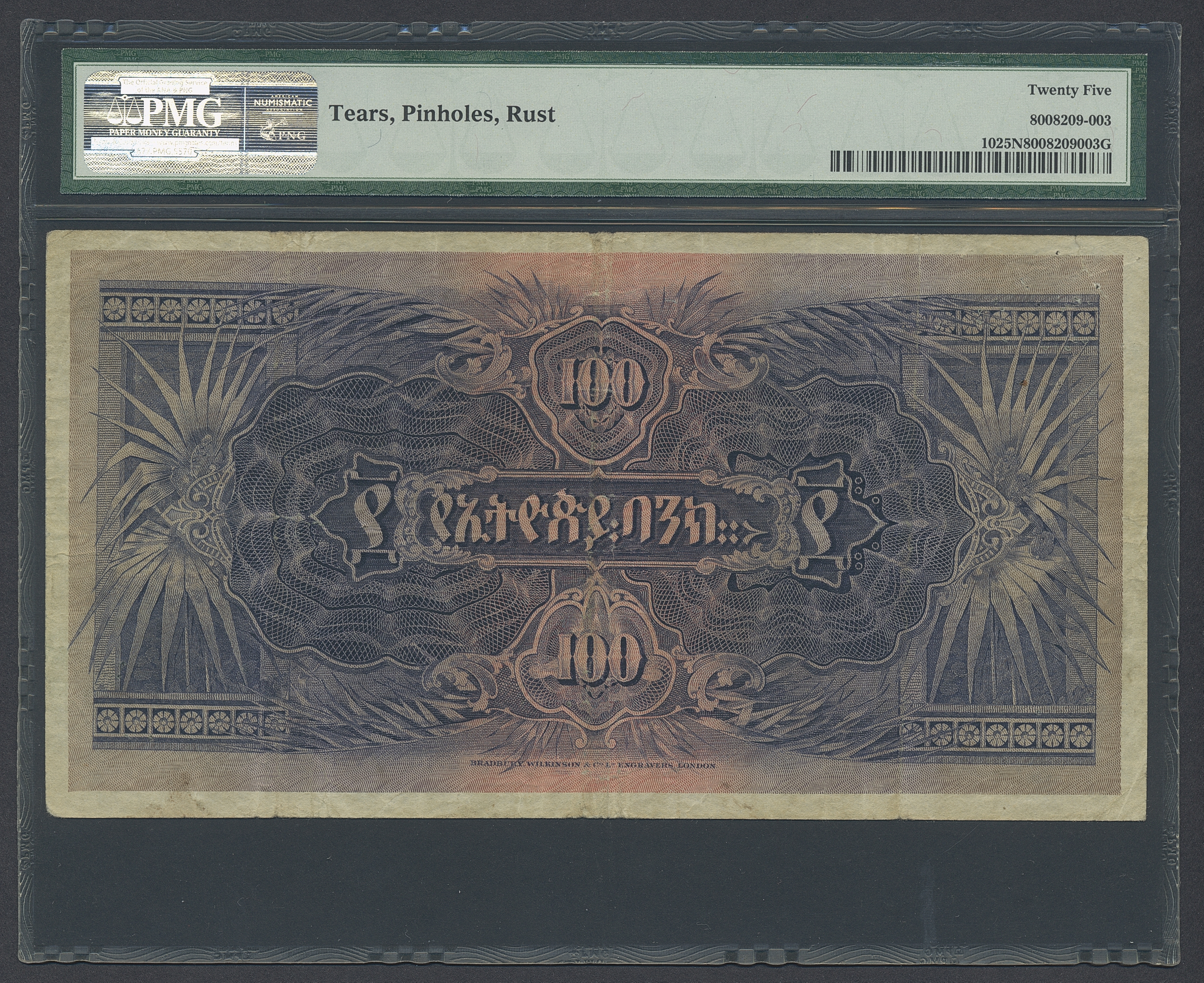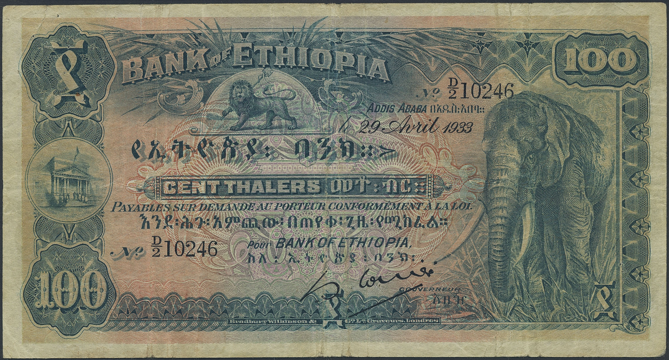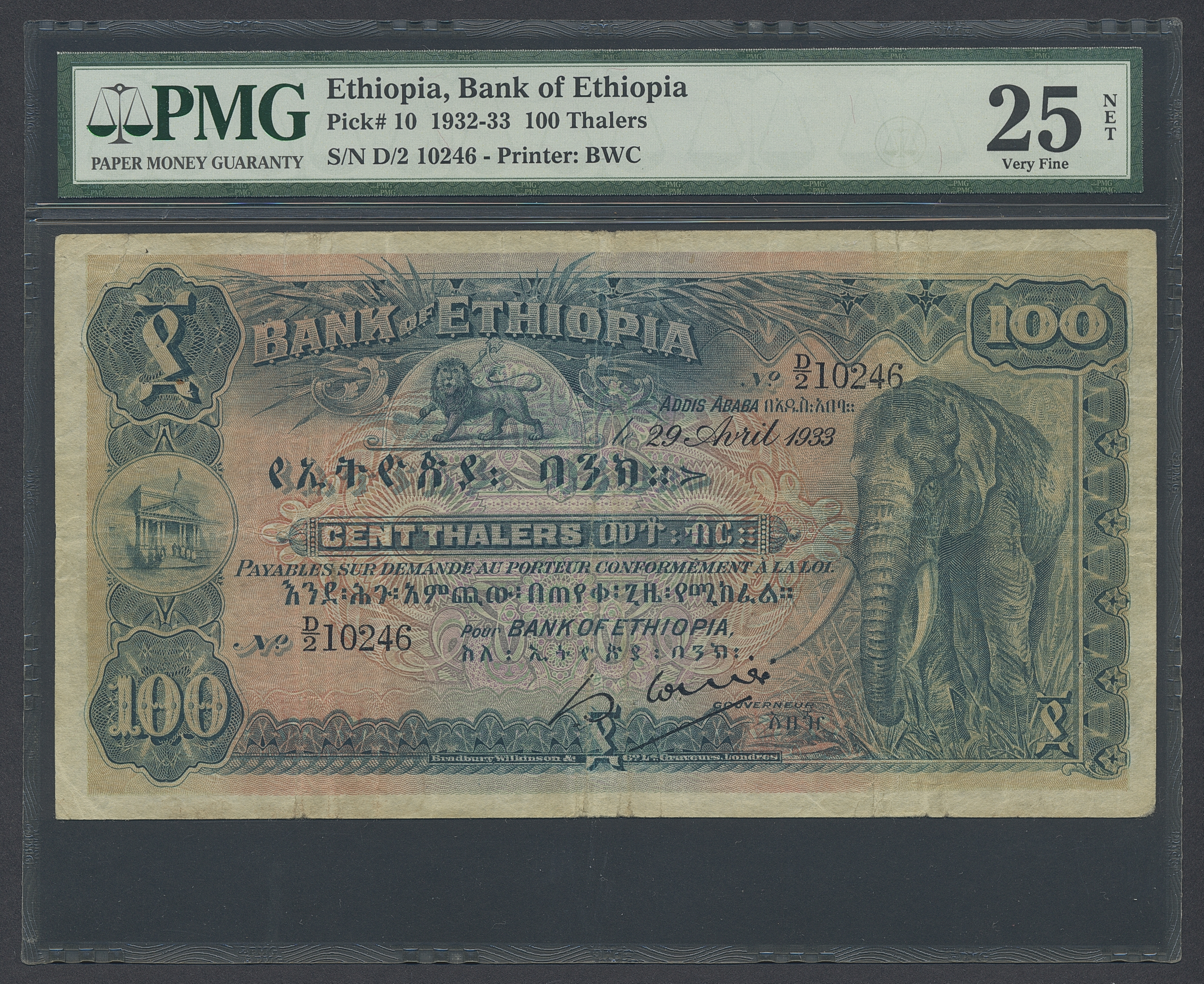 Banknotes, Ethiopia. Pick 10, 100 thalers 1933. No: D72 10246 in PMG as 25 very fine. VF.