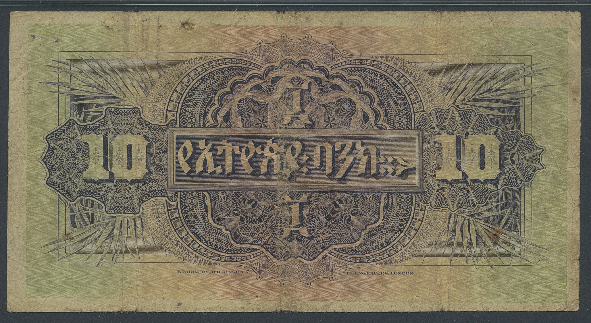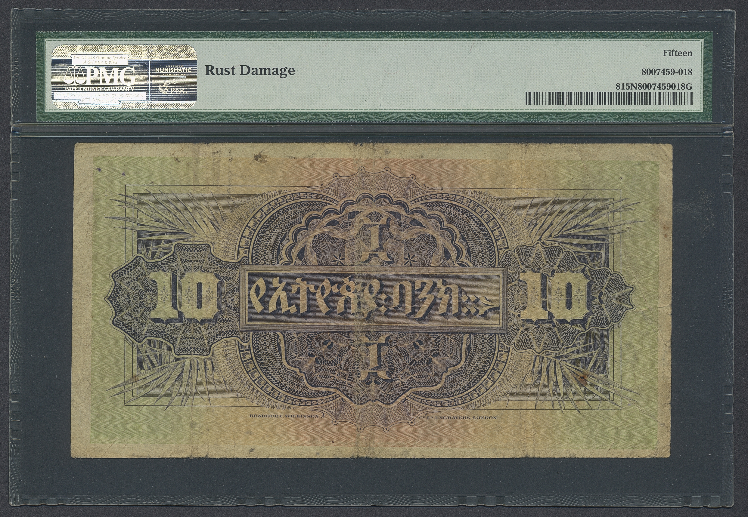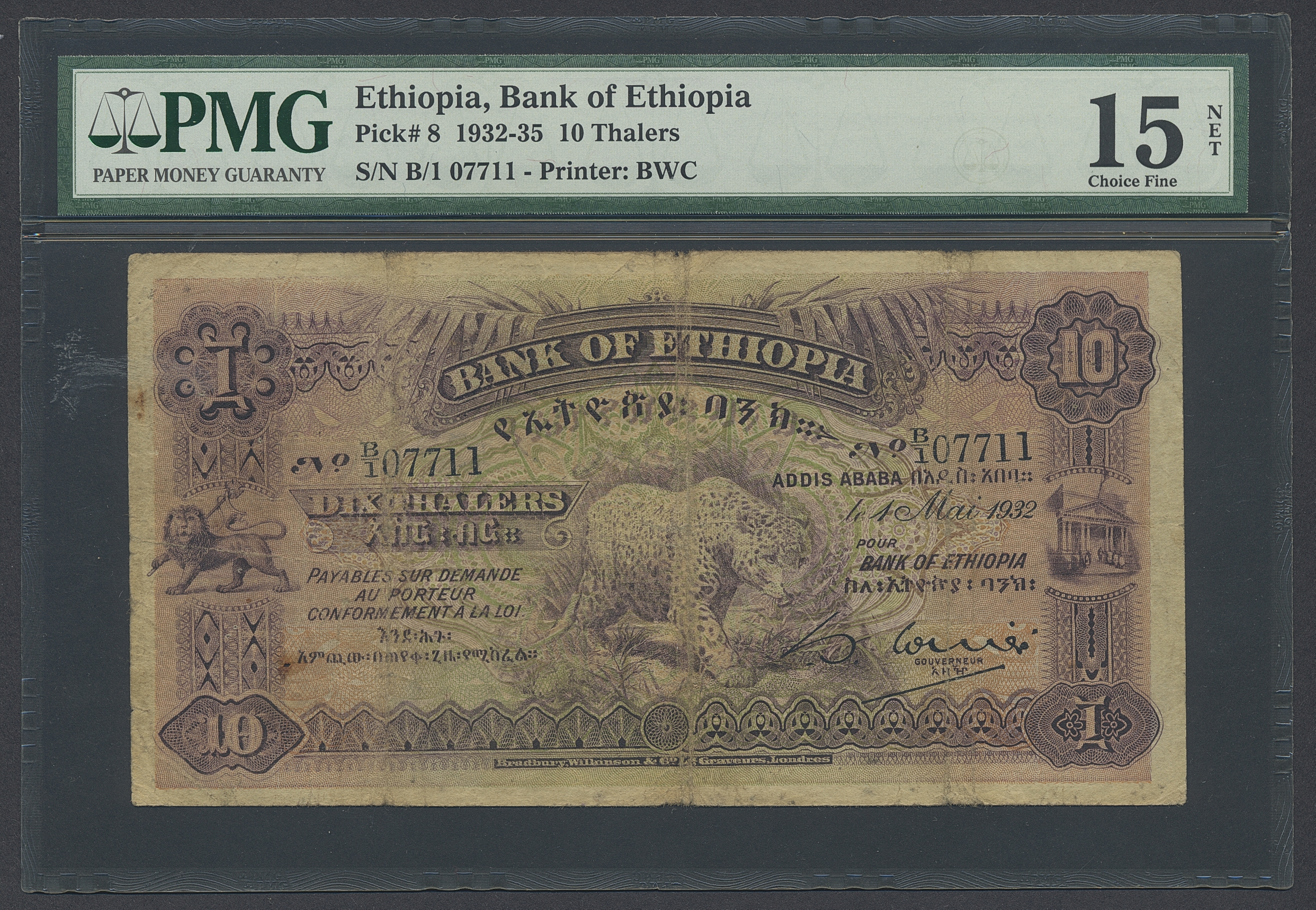 Banknotes, Ethiopia. Pick 8, 10 thalers 1932. No: B/1 7711 in PMG as 15 choice fine. F.