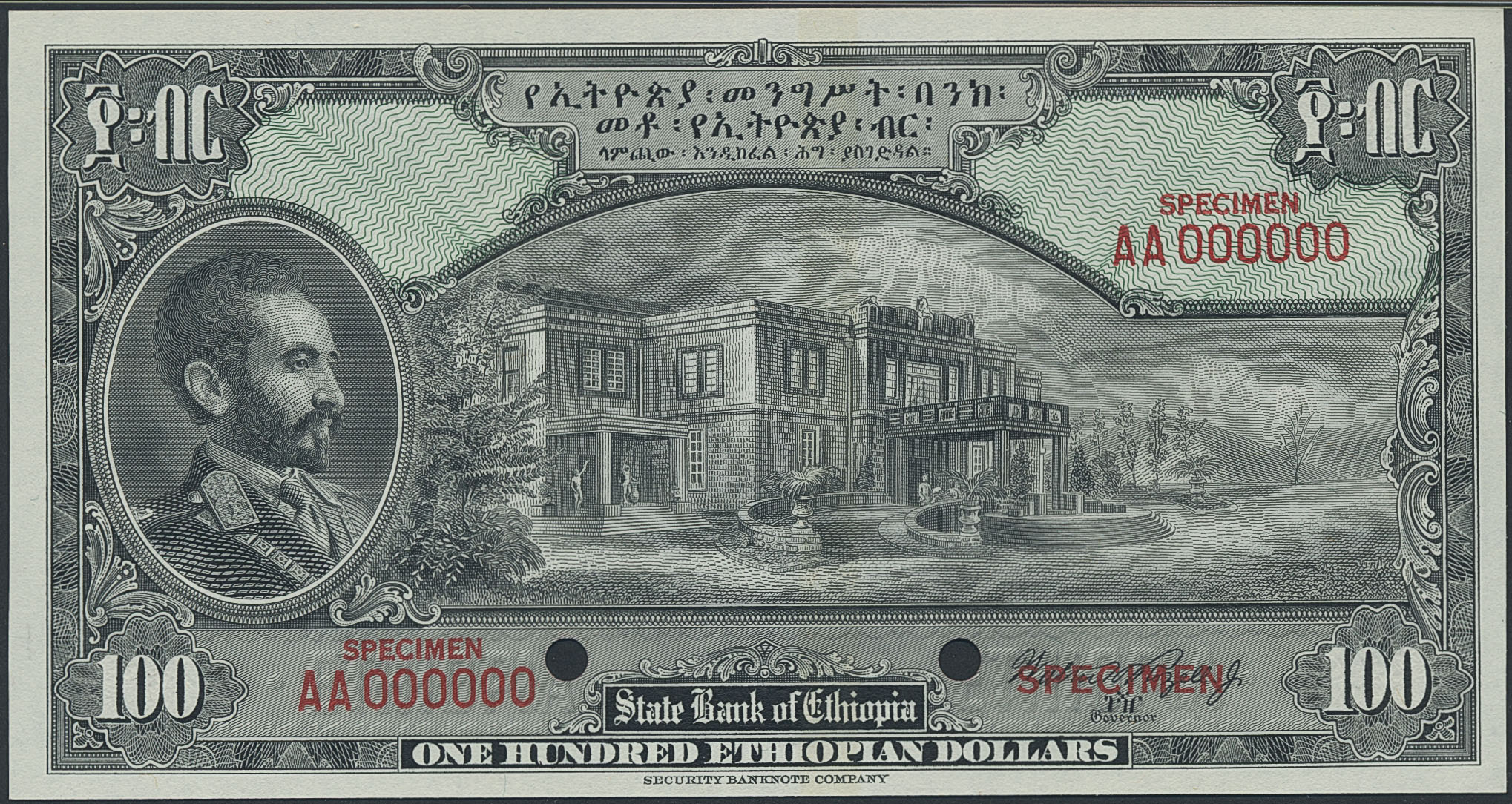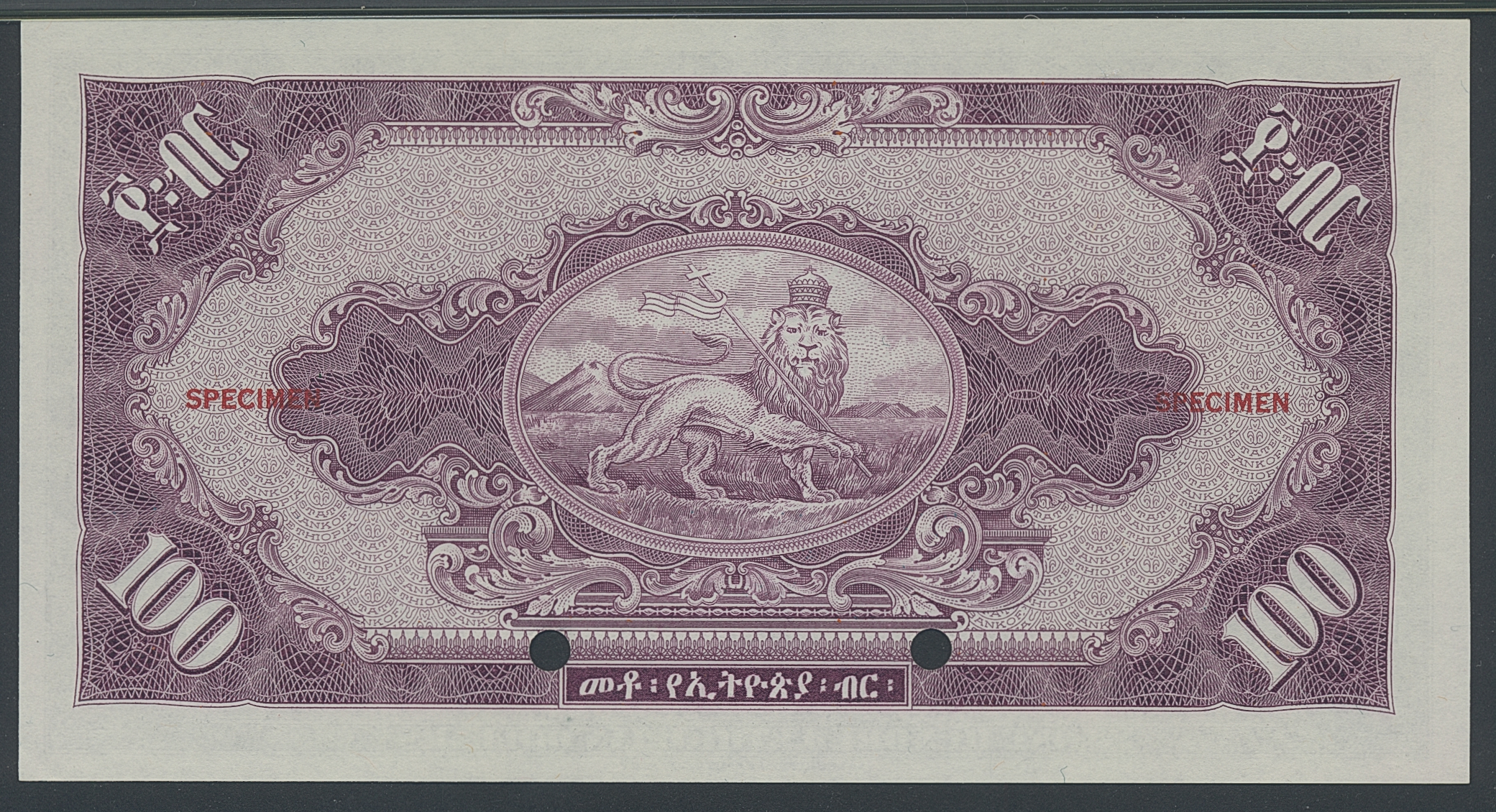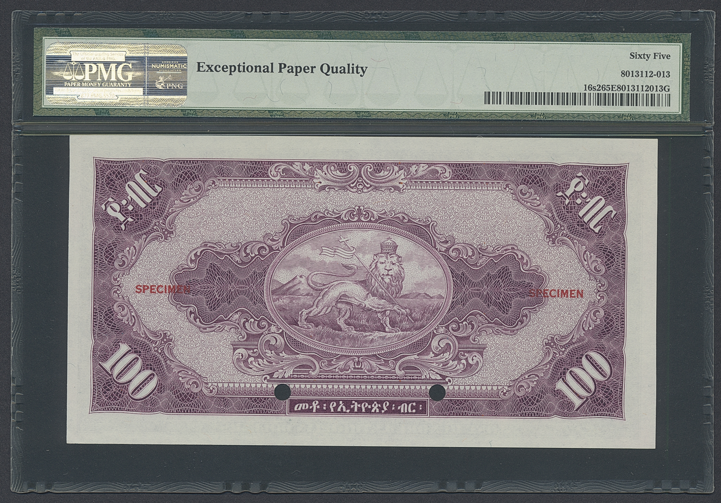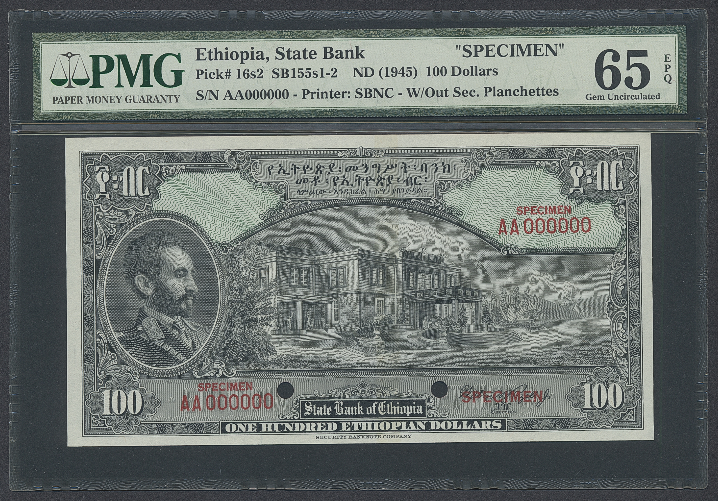 Banknotes, Ethiopia. Pick 16s2, 100 dollars ND (1945). Specimen note. Graded by PMG as uncirculated 65 EPQ. UNC.