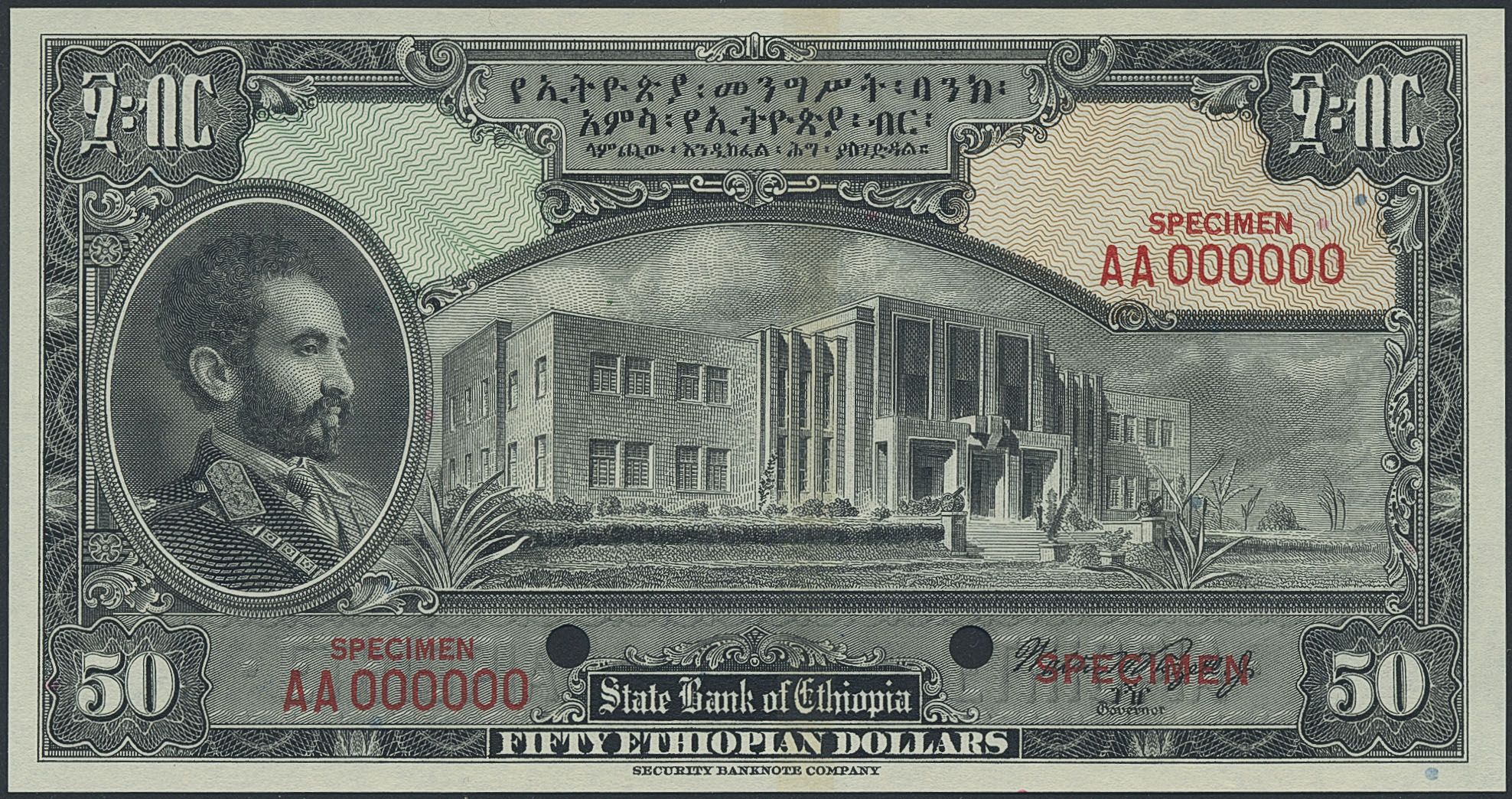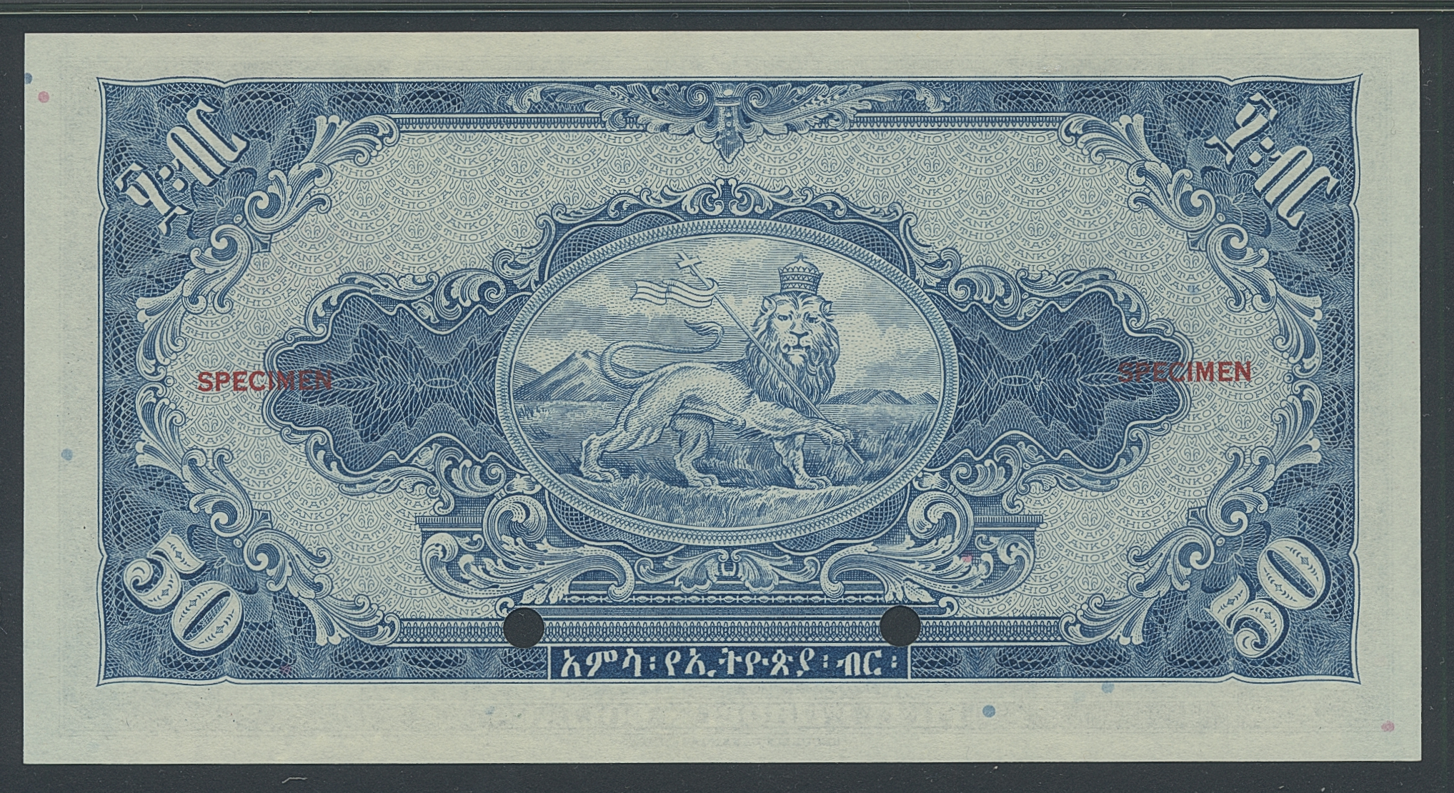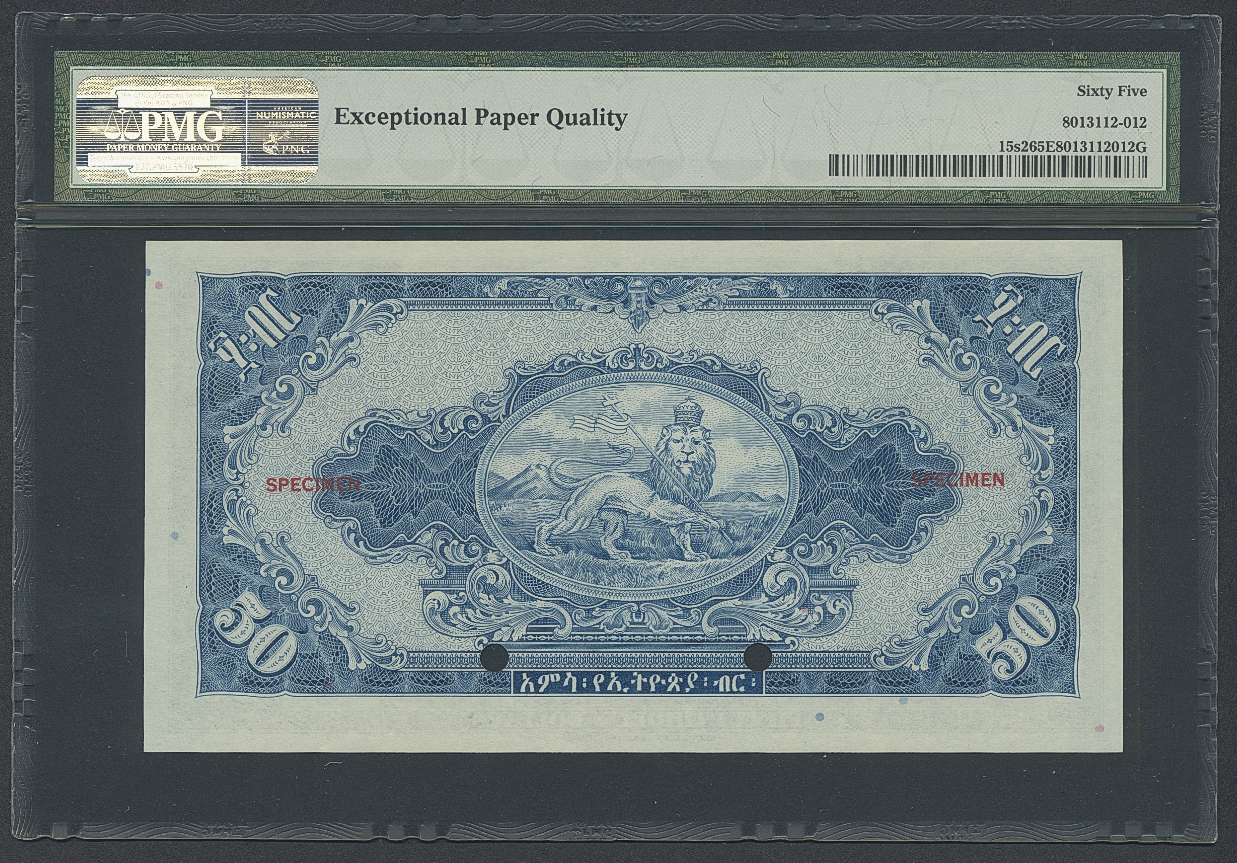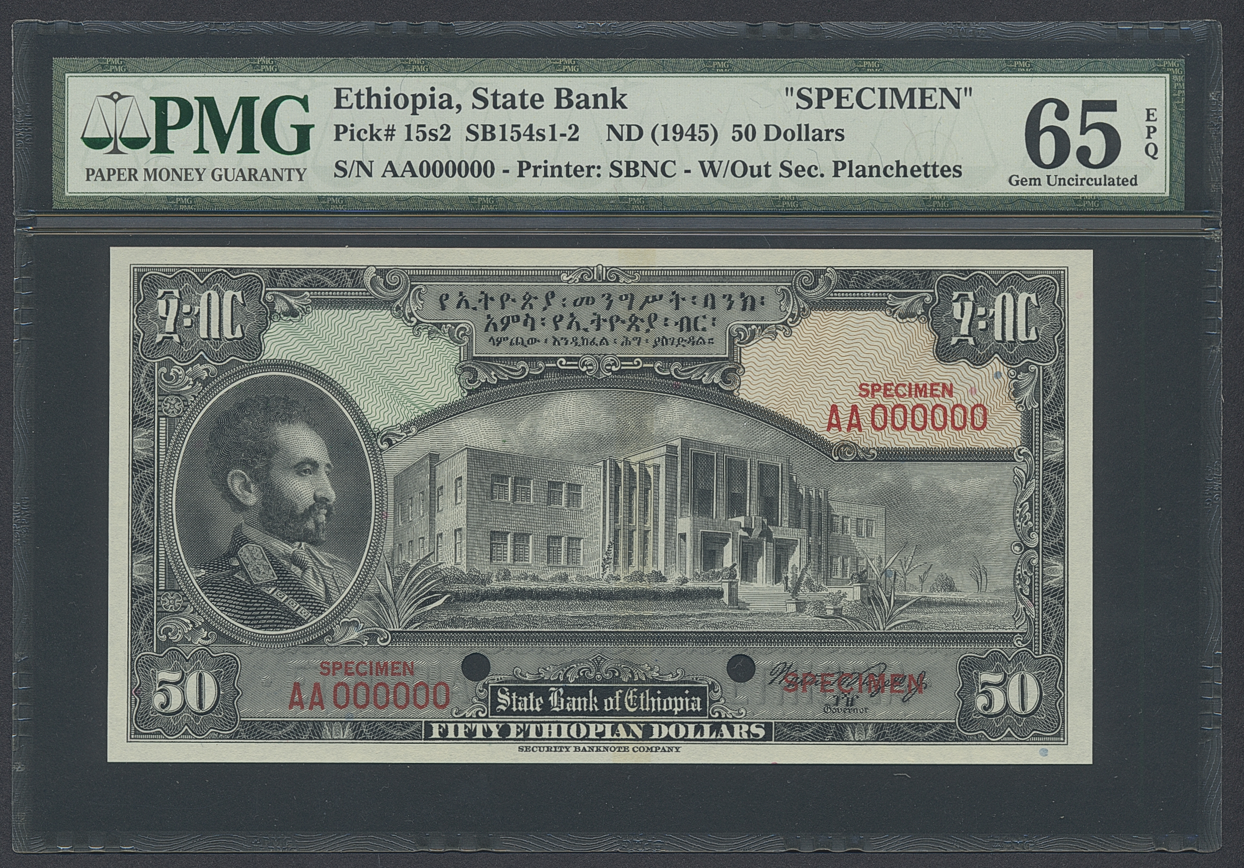 Banknotes, Ethiopia. Pick 15s2, 50 dollars ND (1945). Specimen note. Graded by PMG as uncirculated 65 EPQ. UNC.