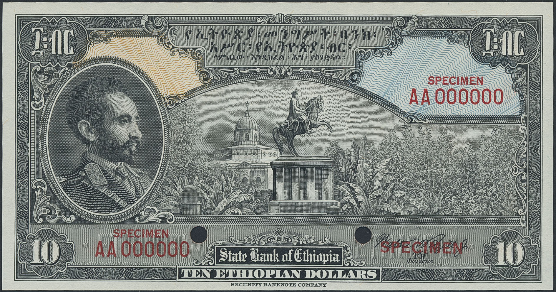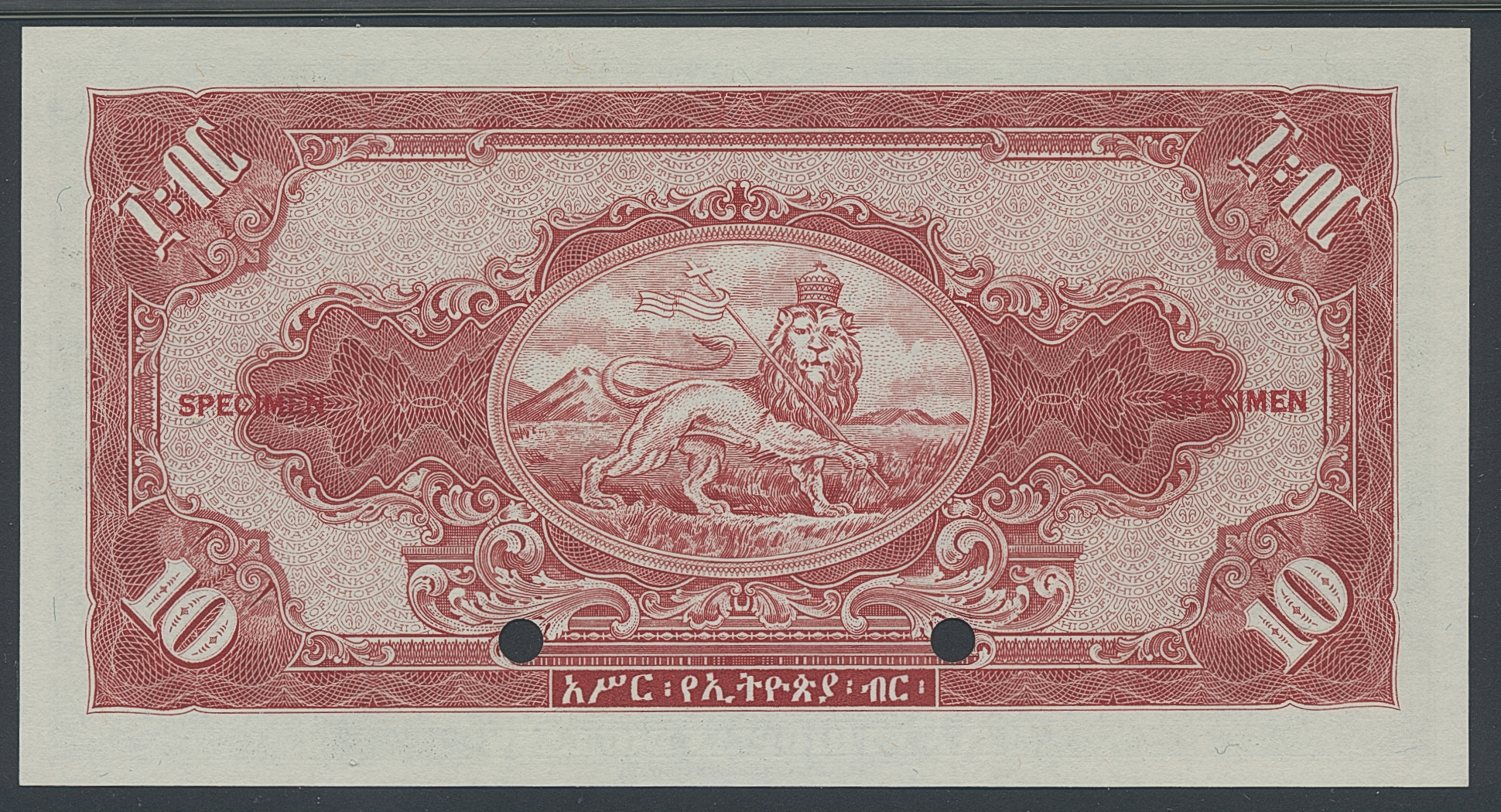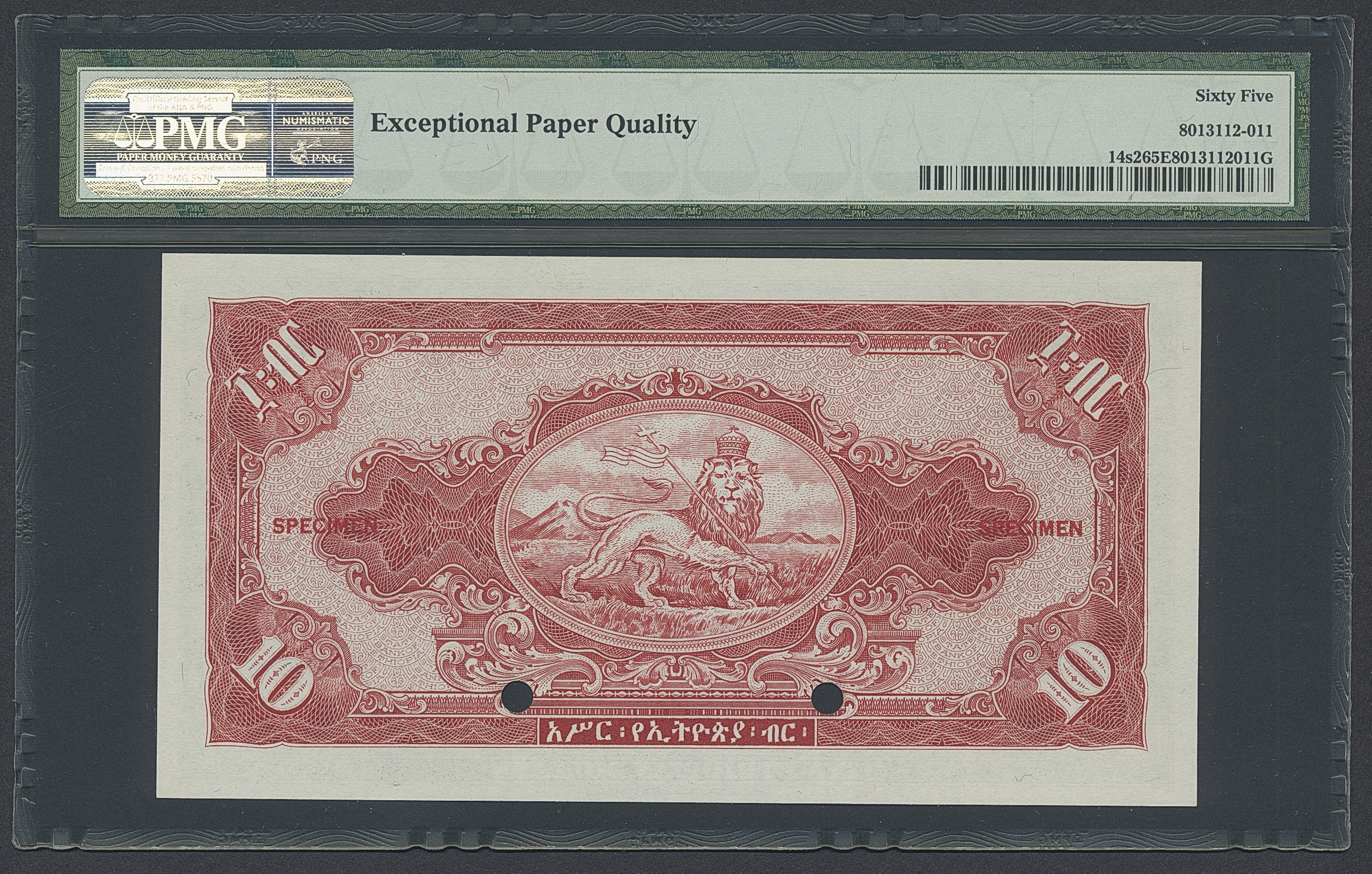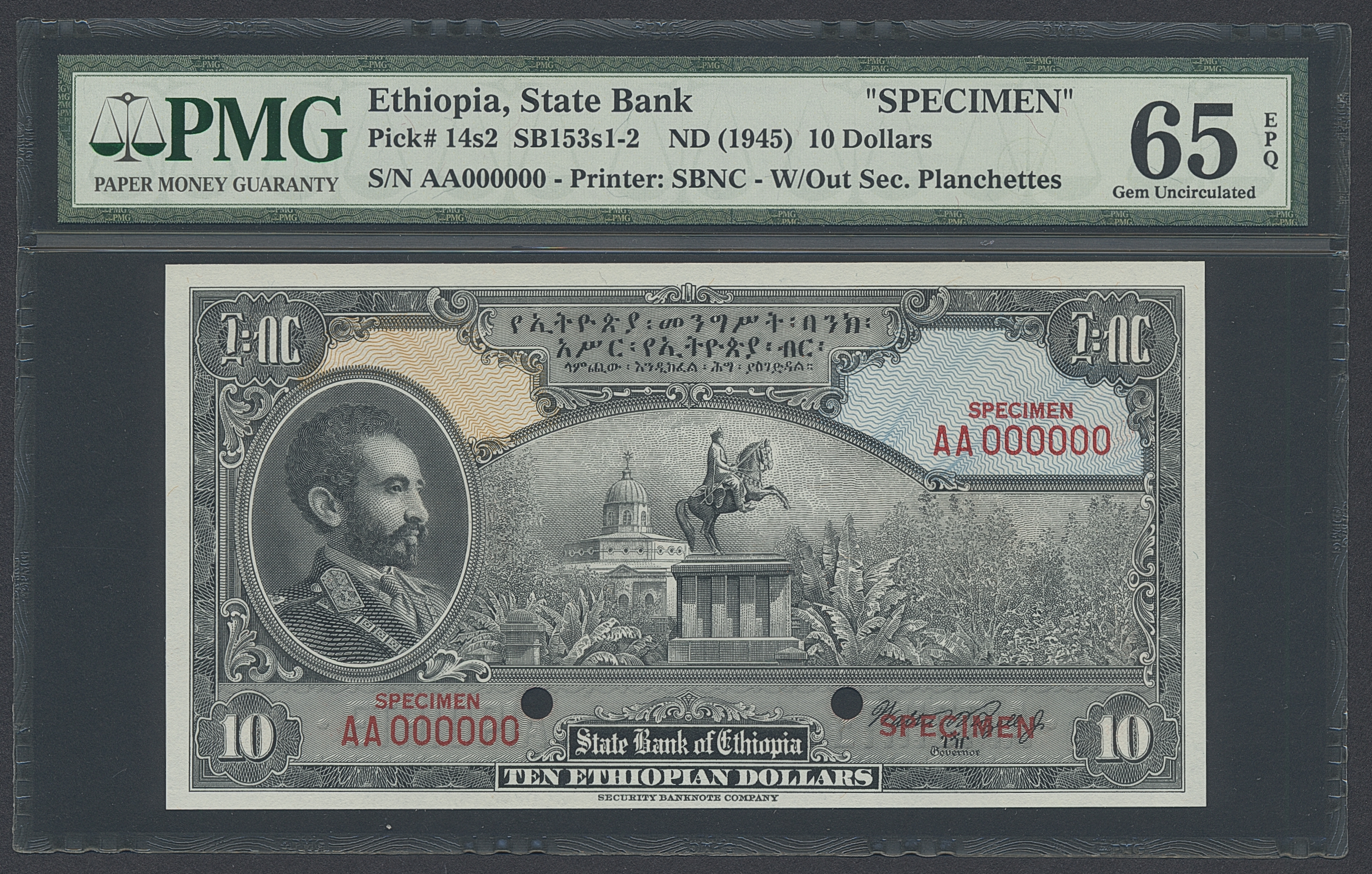 Banknotes, Ethiopia. Pick 14s2, 10 dollars ND (1945). Specimen note. Graded by PMG as uncirculated 65 EPQ. UNC.