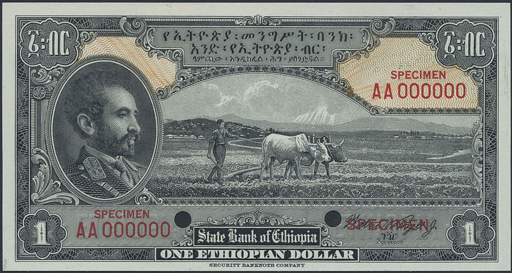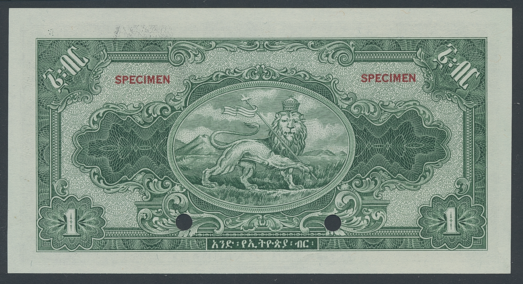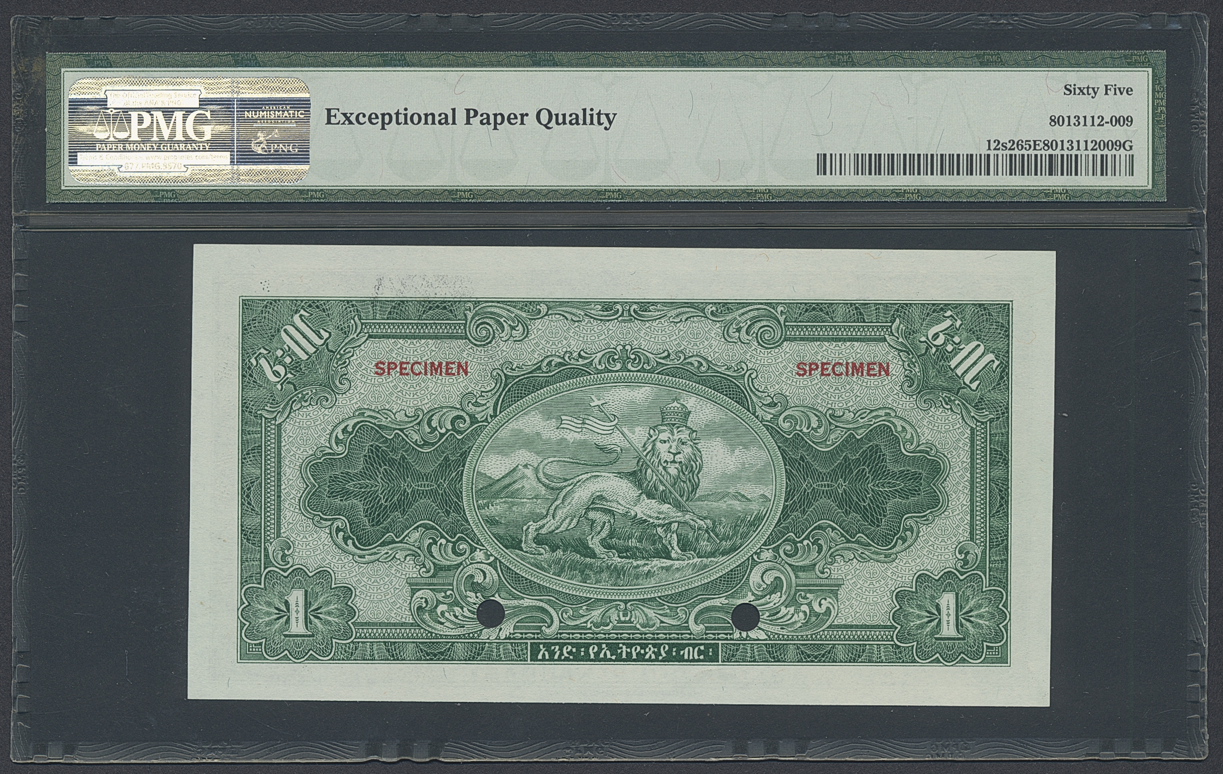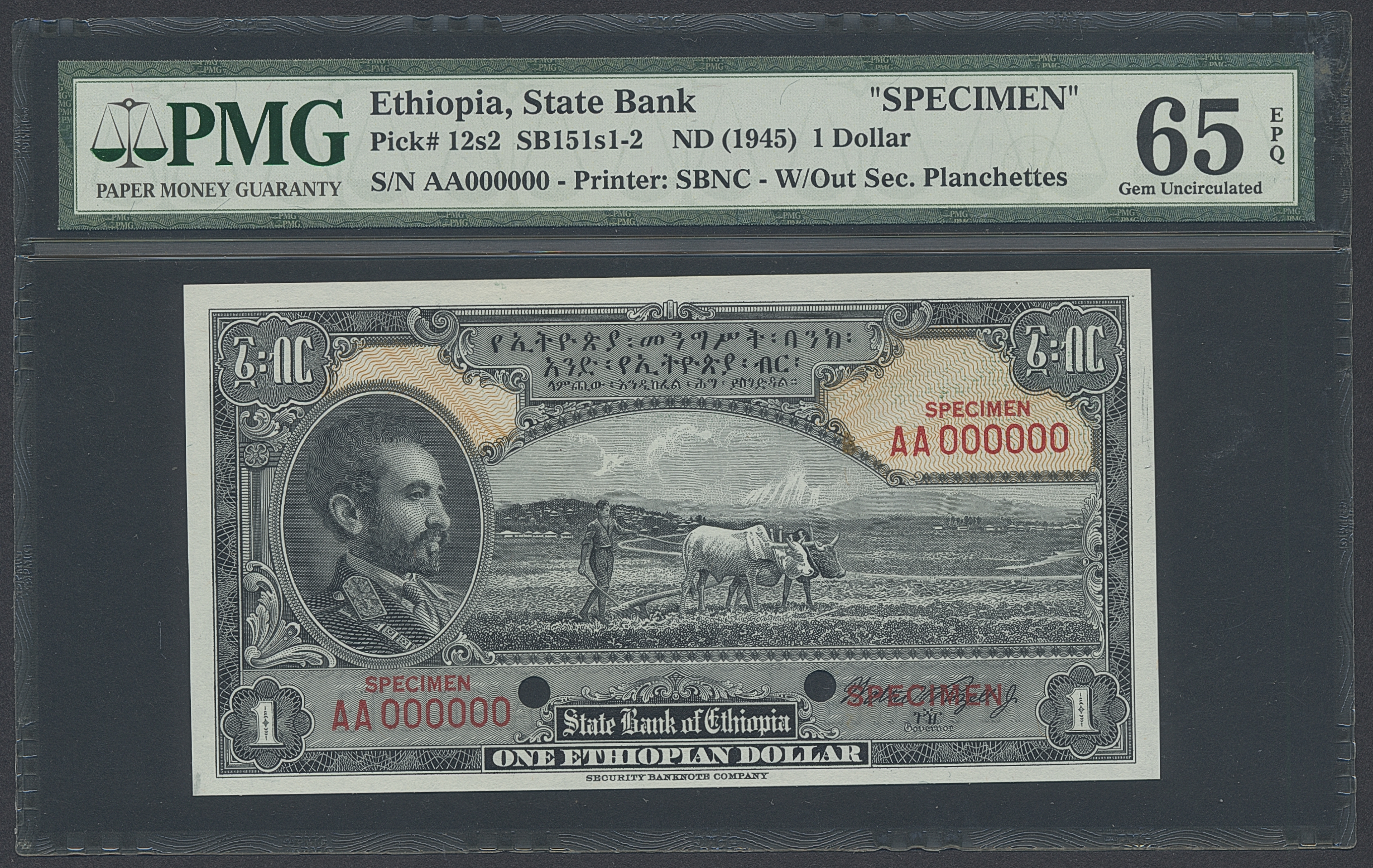 Banknotes, Ethiopia. Pick 12s2, 1 dollar ND (1945). Specimen note. Graded by PMG as uncirculated 65 EPQ. UNC.