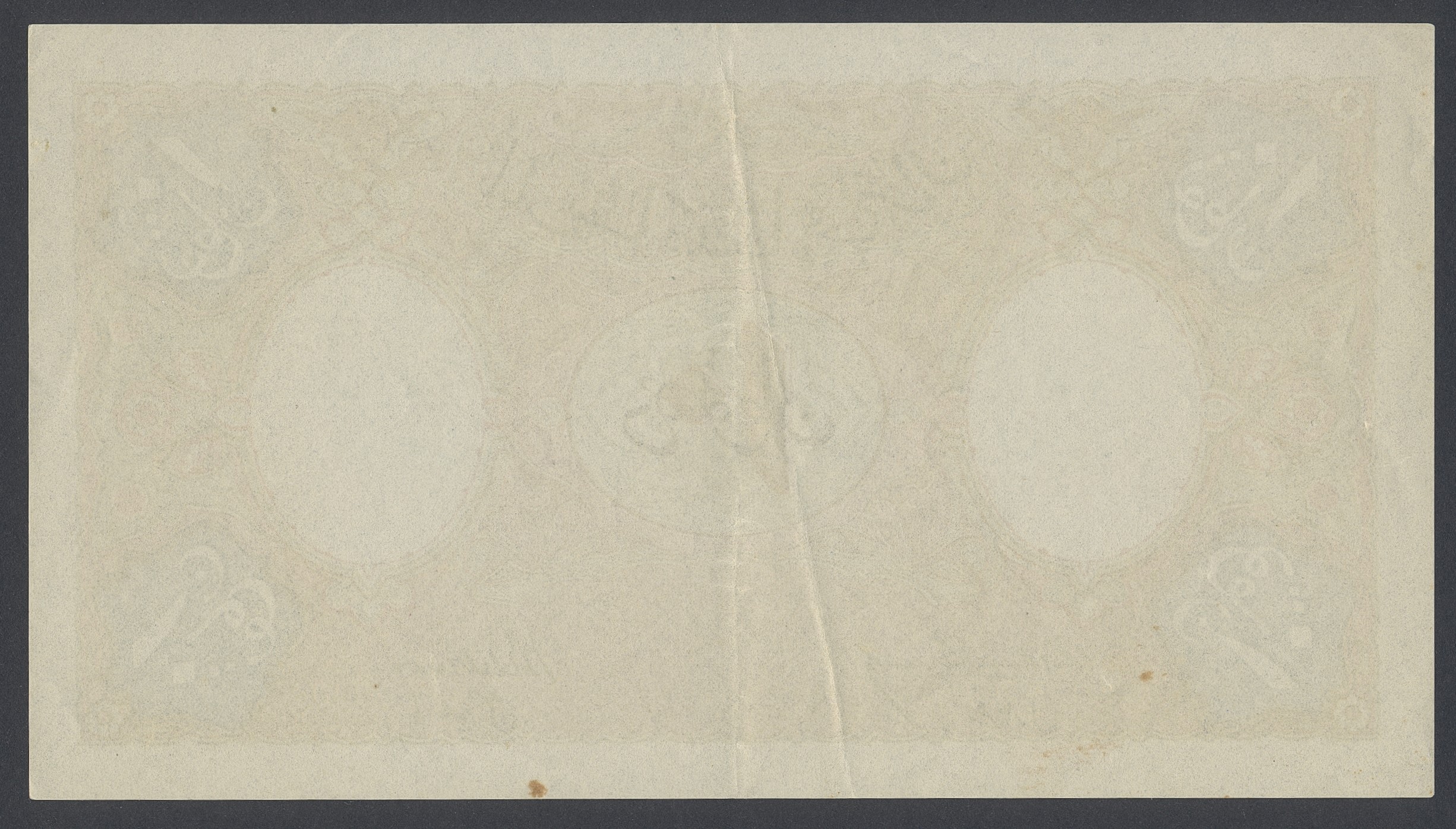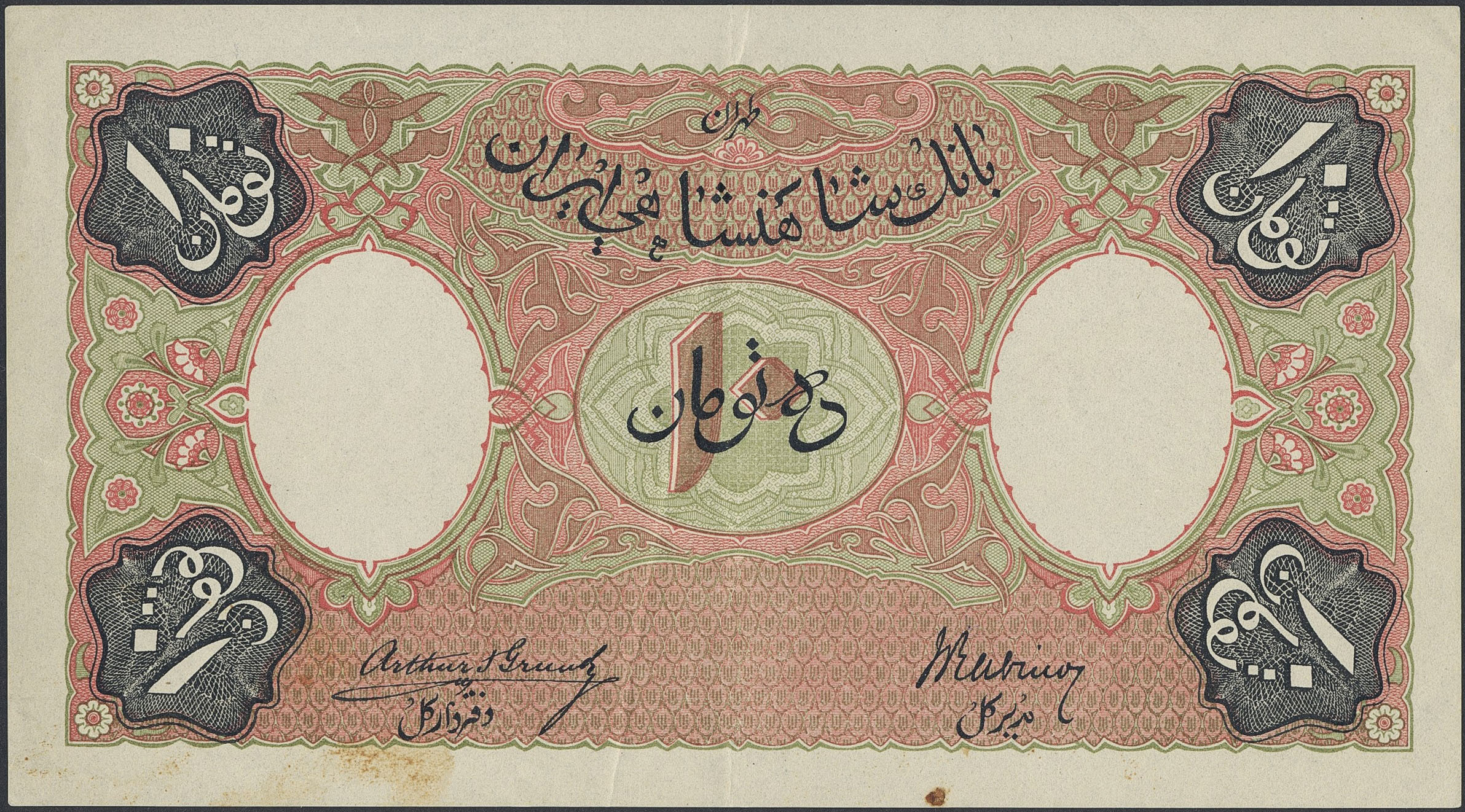 Banknotes, Iran. Pick 4var, 10 tomans. ND (1890–1923). Unfinished one sided banknote (obverse) without portrait in ovals. VF.