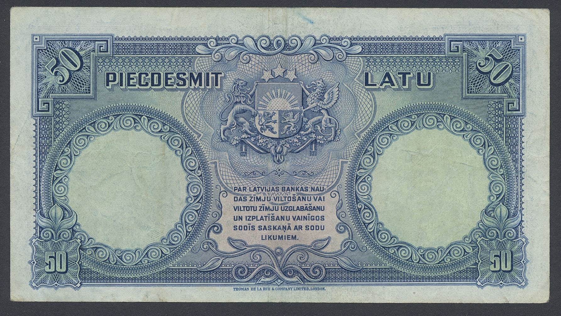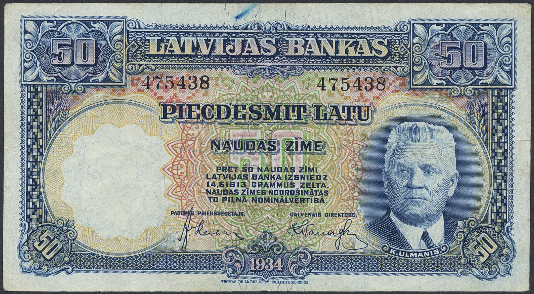 Banknotes, Latvia. Pick 20a, 50 latu 1934. 475438. Small crayon mark in blue. VF.
