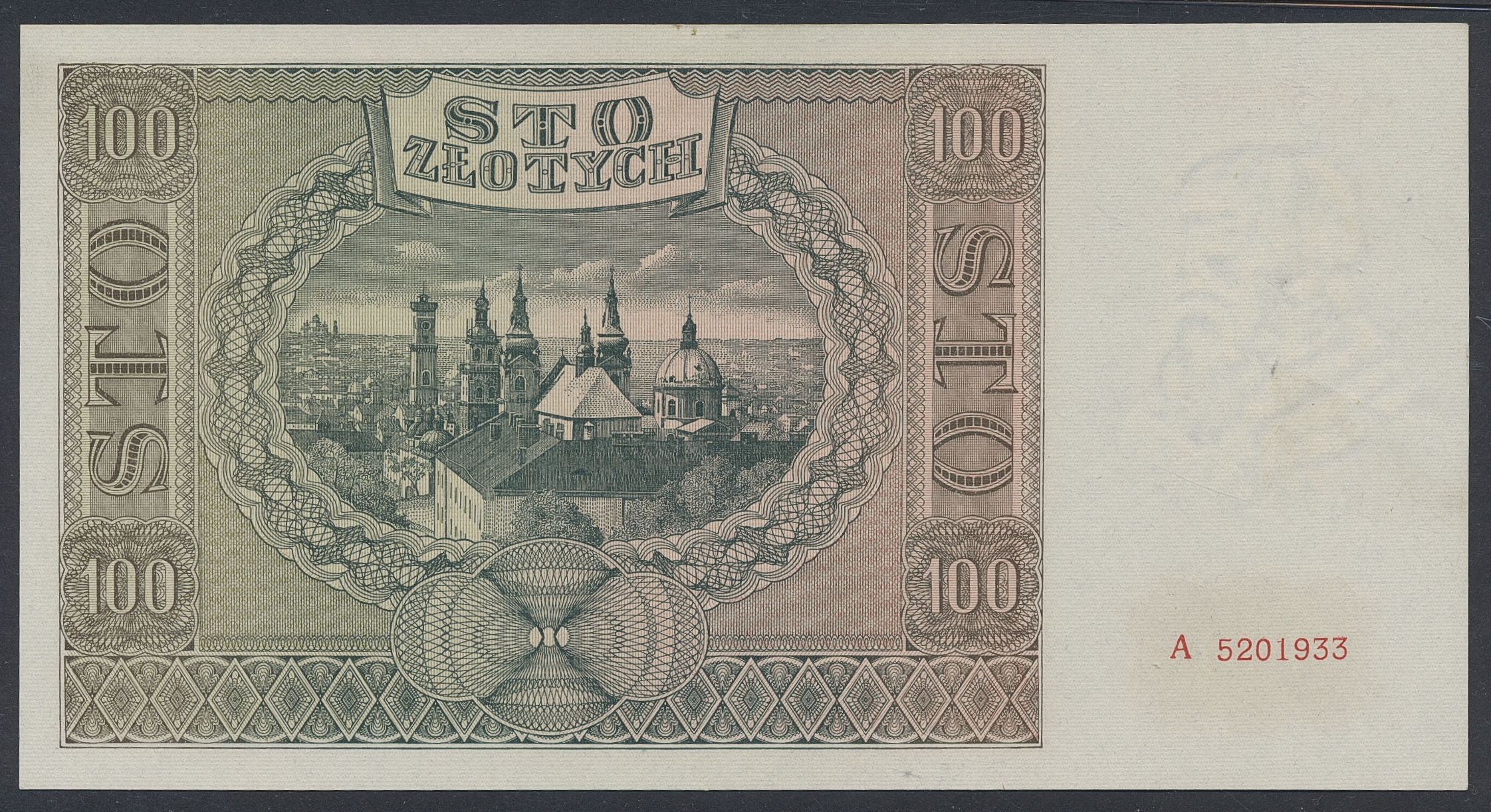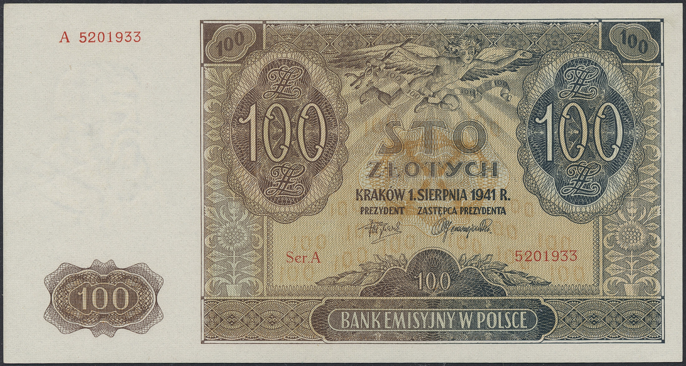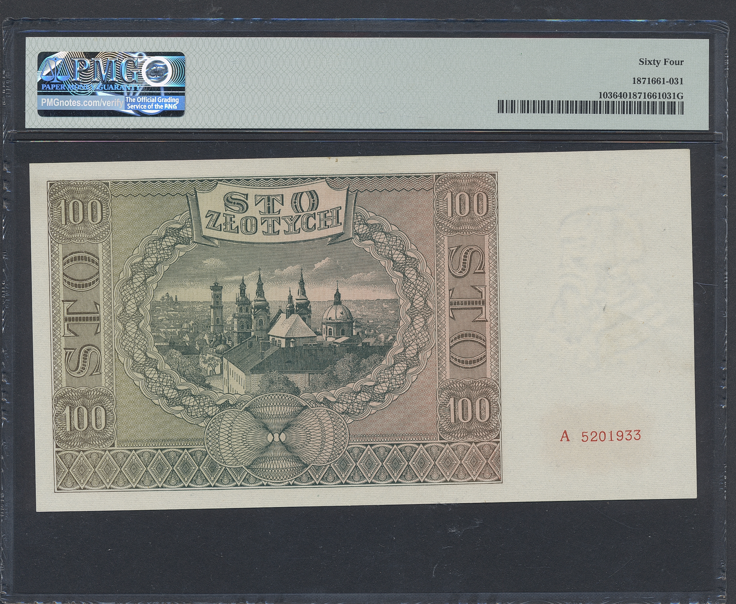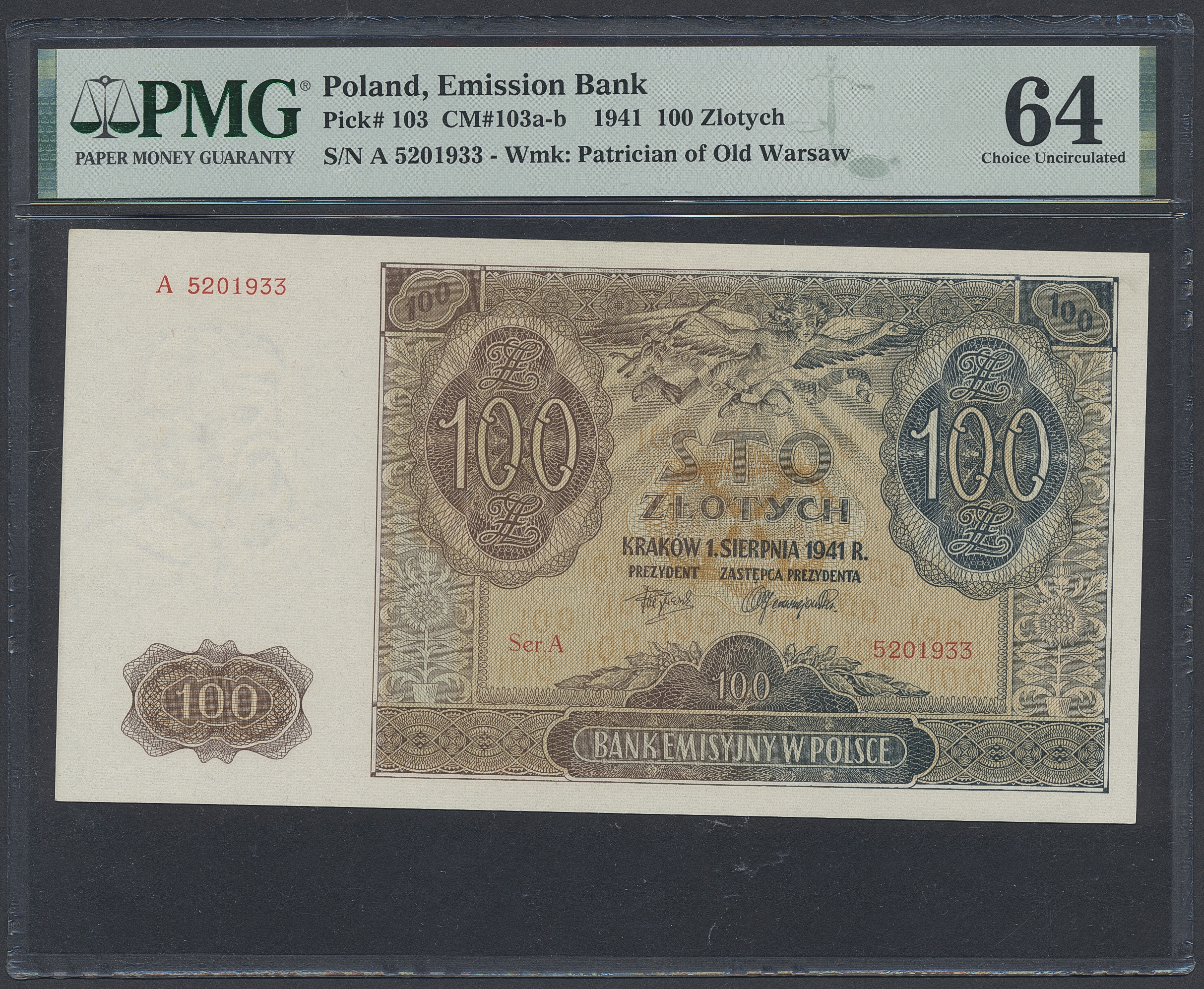 Banknotes, Poland. Pick 103, 100 zlotych 1941. A 5201933. Graded by PMG as uncirculated 64. UNC.