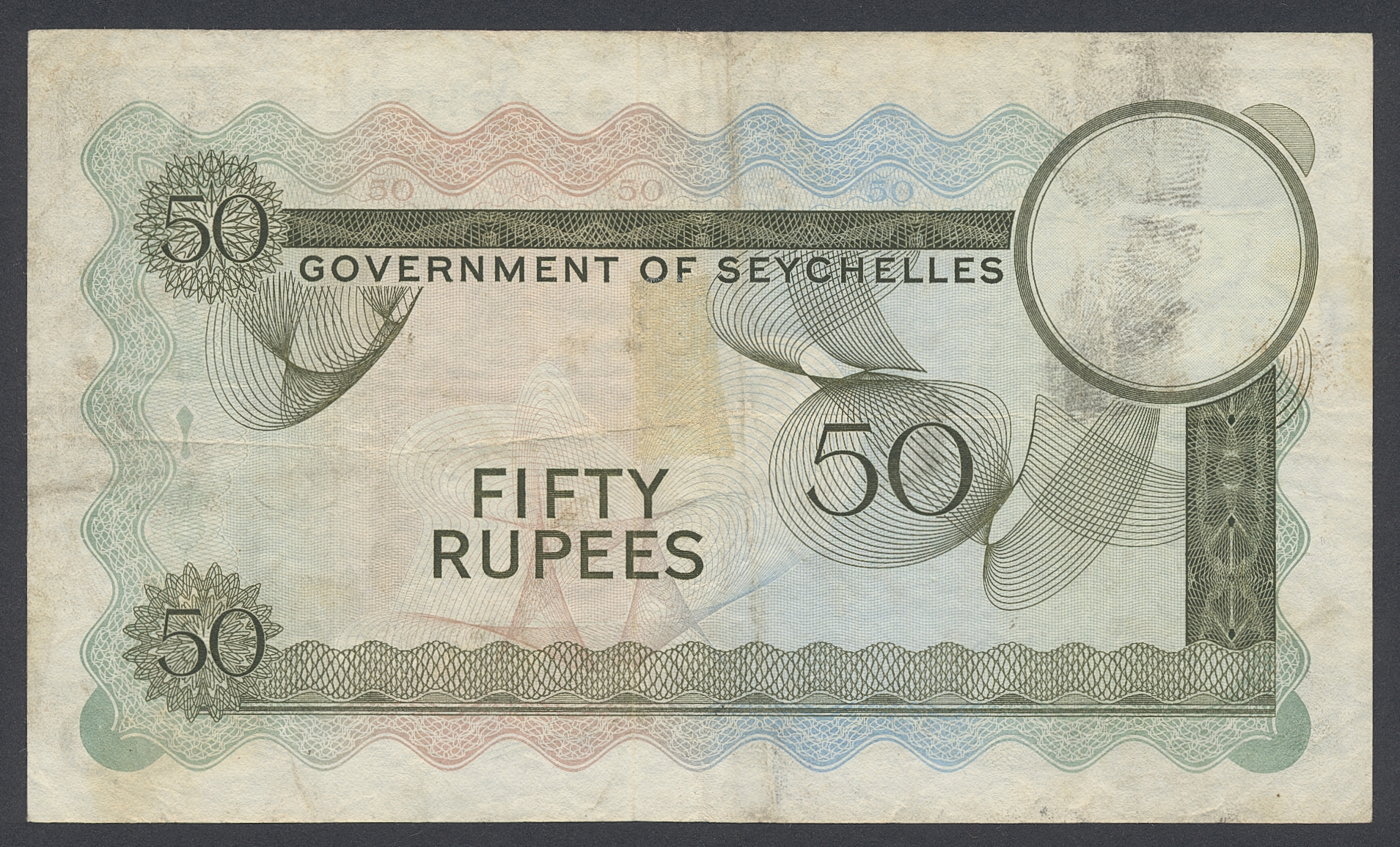 Banknotes, Seychelles. Pick 17 e, 50 rupees 1973. No: A/I 190882, 1/8 1973. Small trace of adheshive on back. VF.
