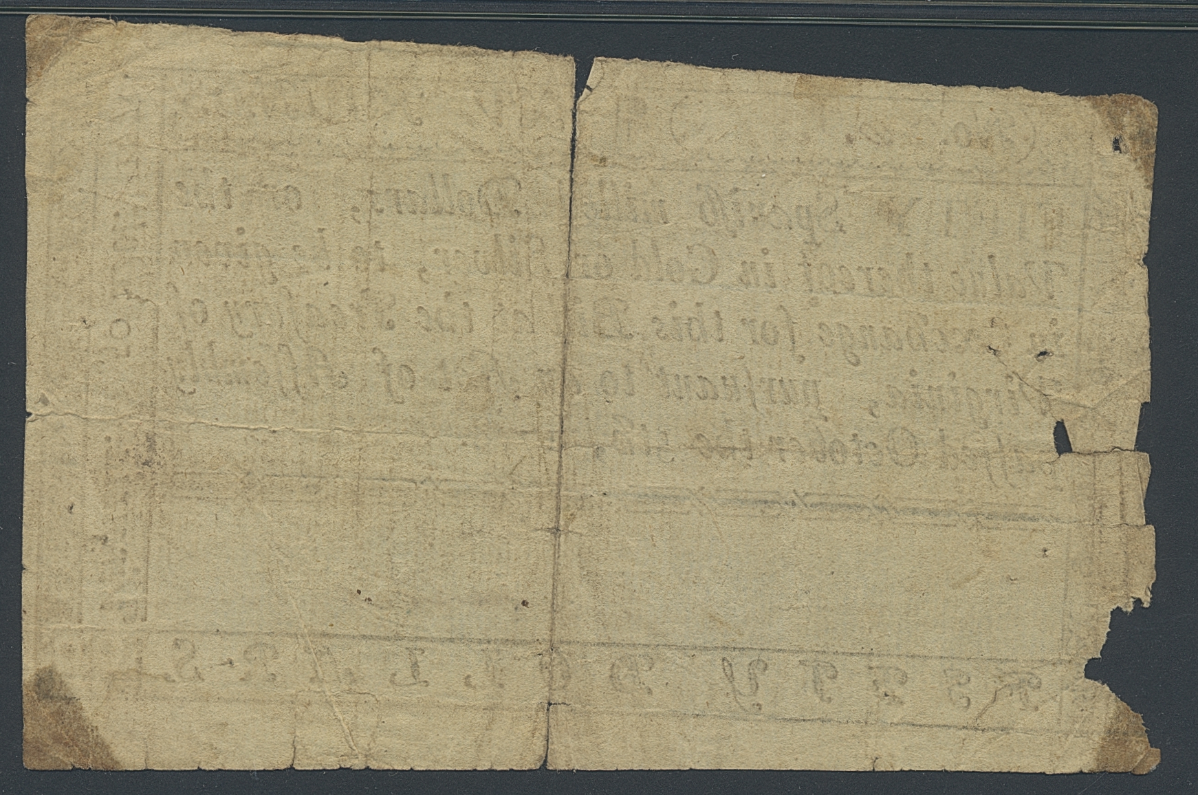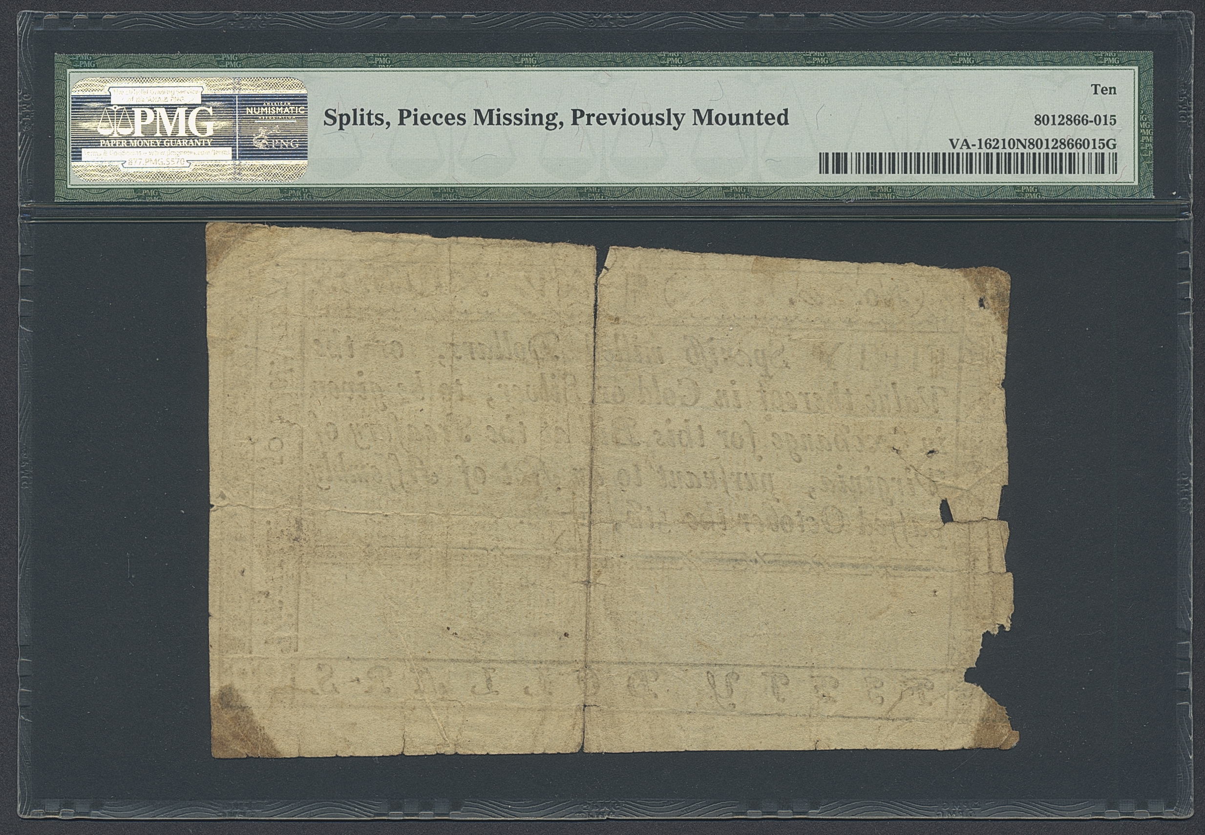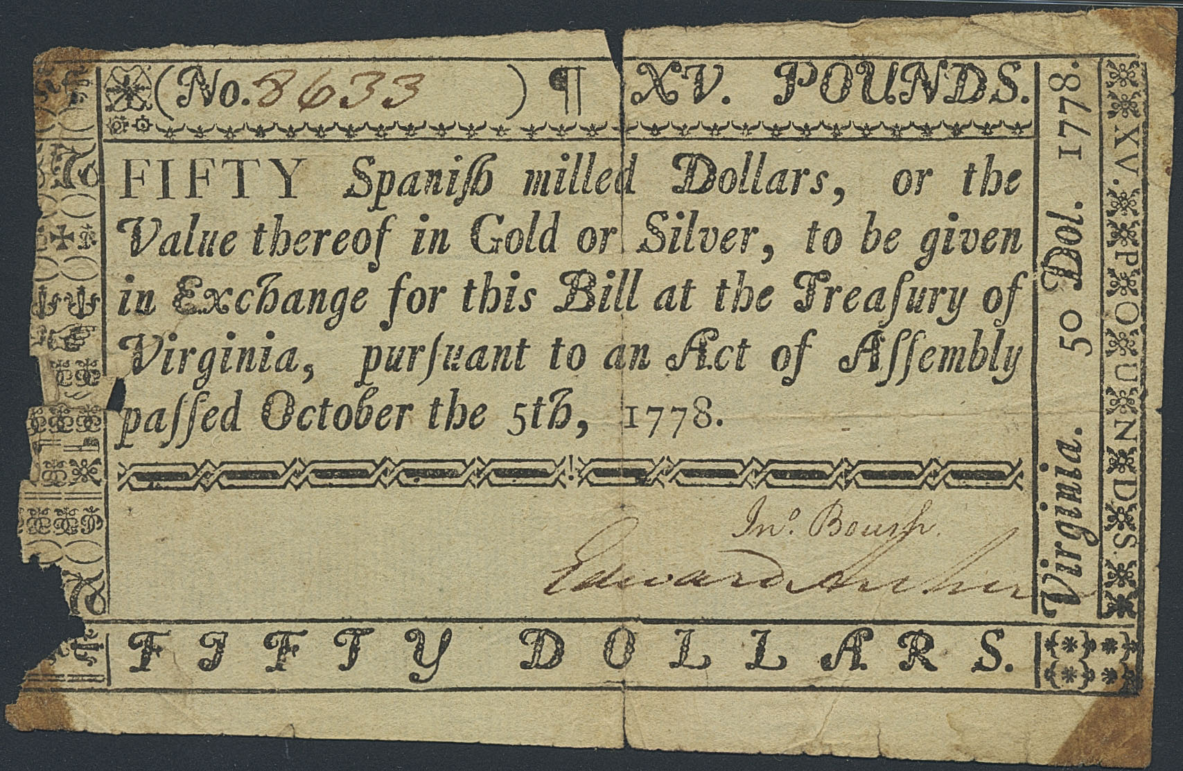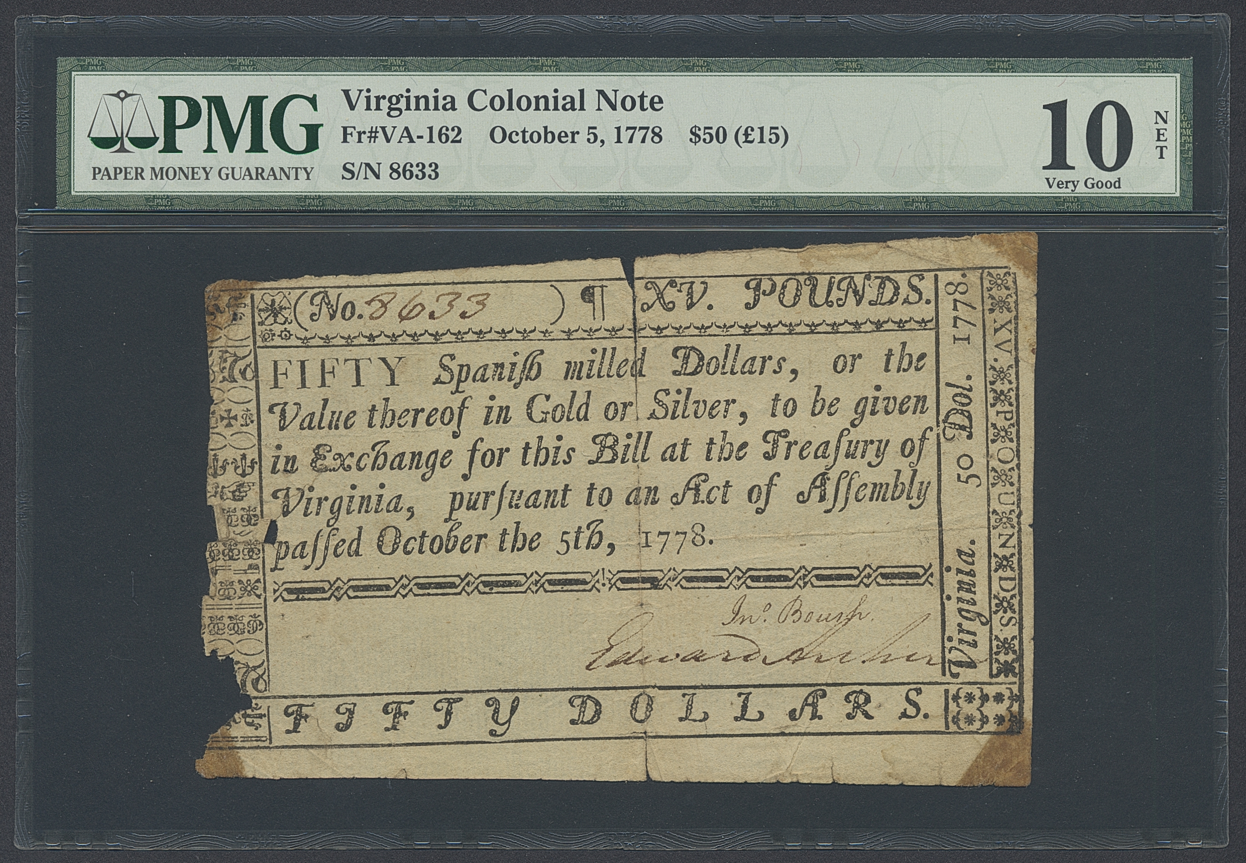 Banknotes, U.S.A. Fr VA-162, 50 dollars 1778. No 8633. Dated October 5. Graded by PMG as very good 10 NET. Tears, paper loss in margin and previously mounted in corners on back. VG.