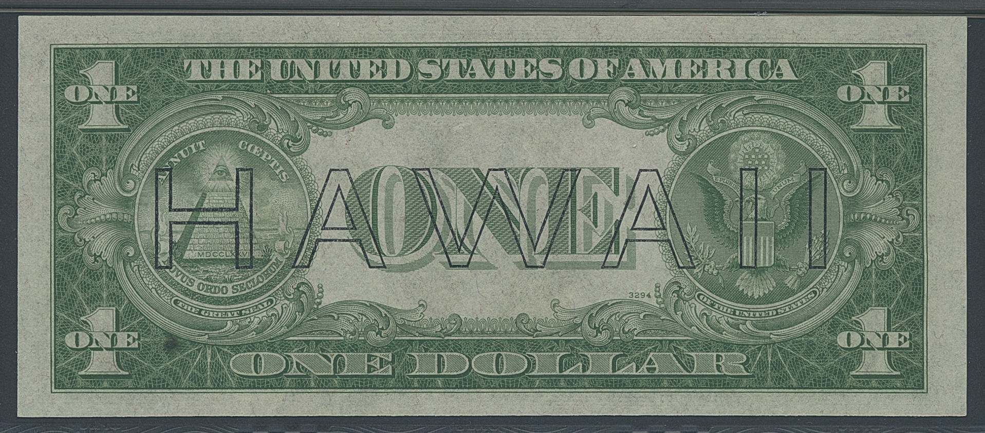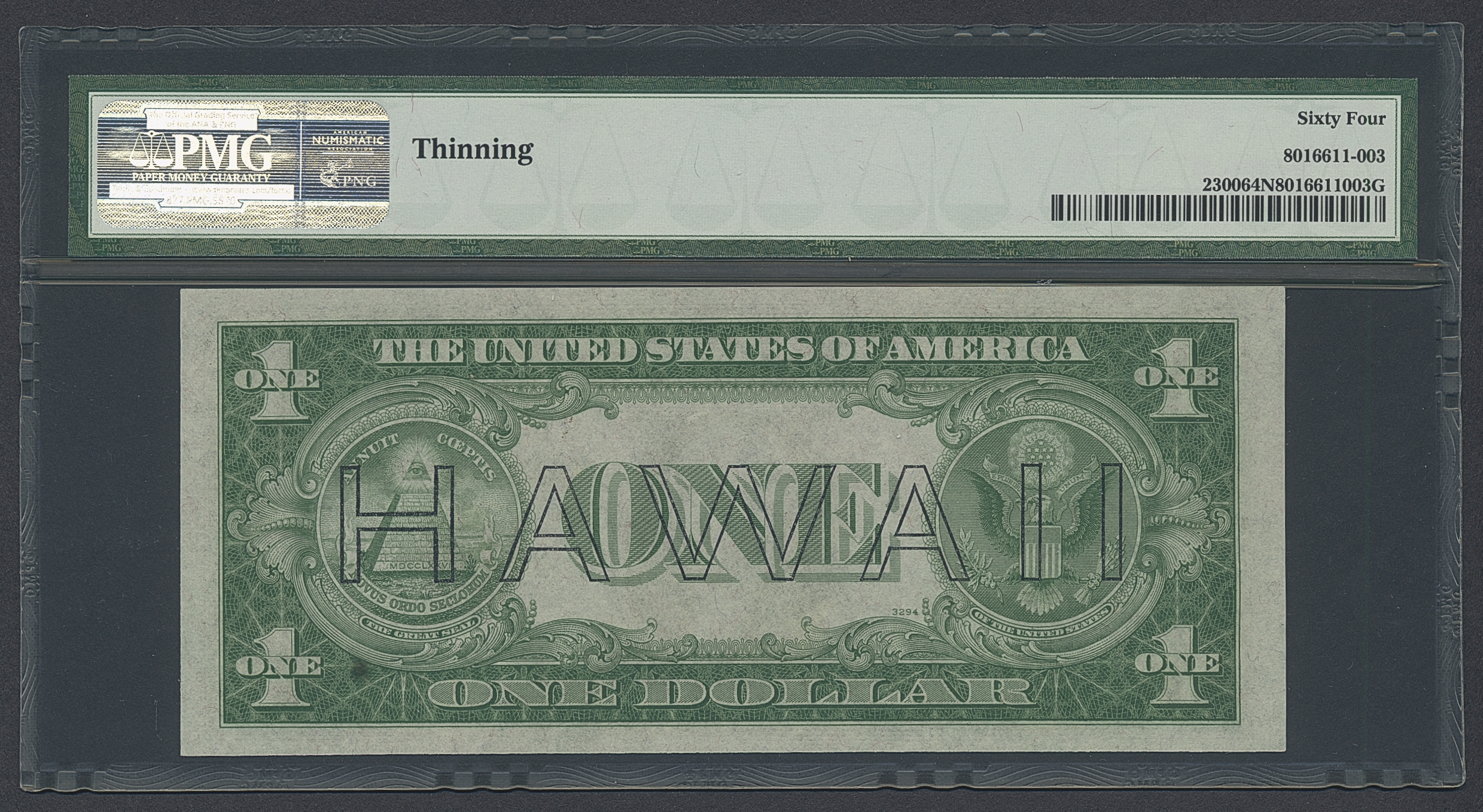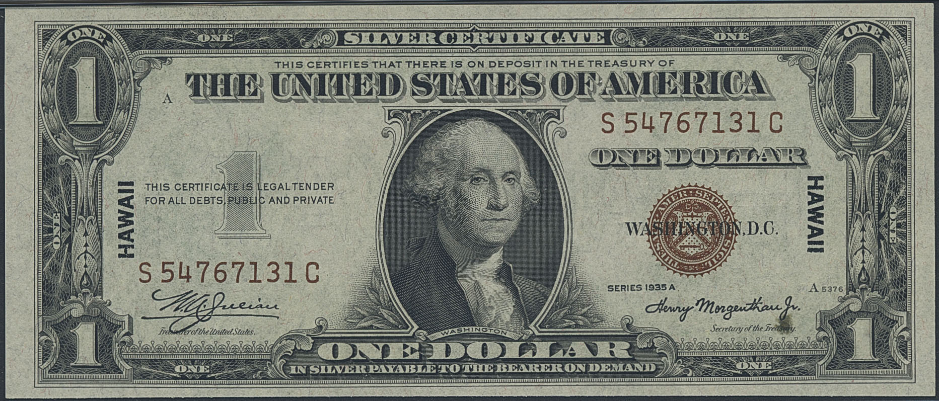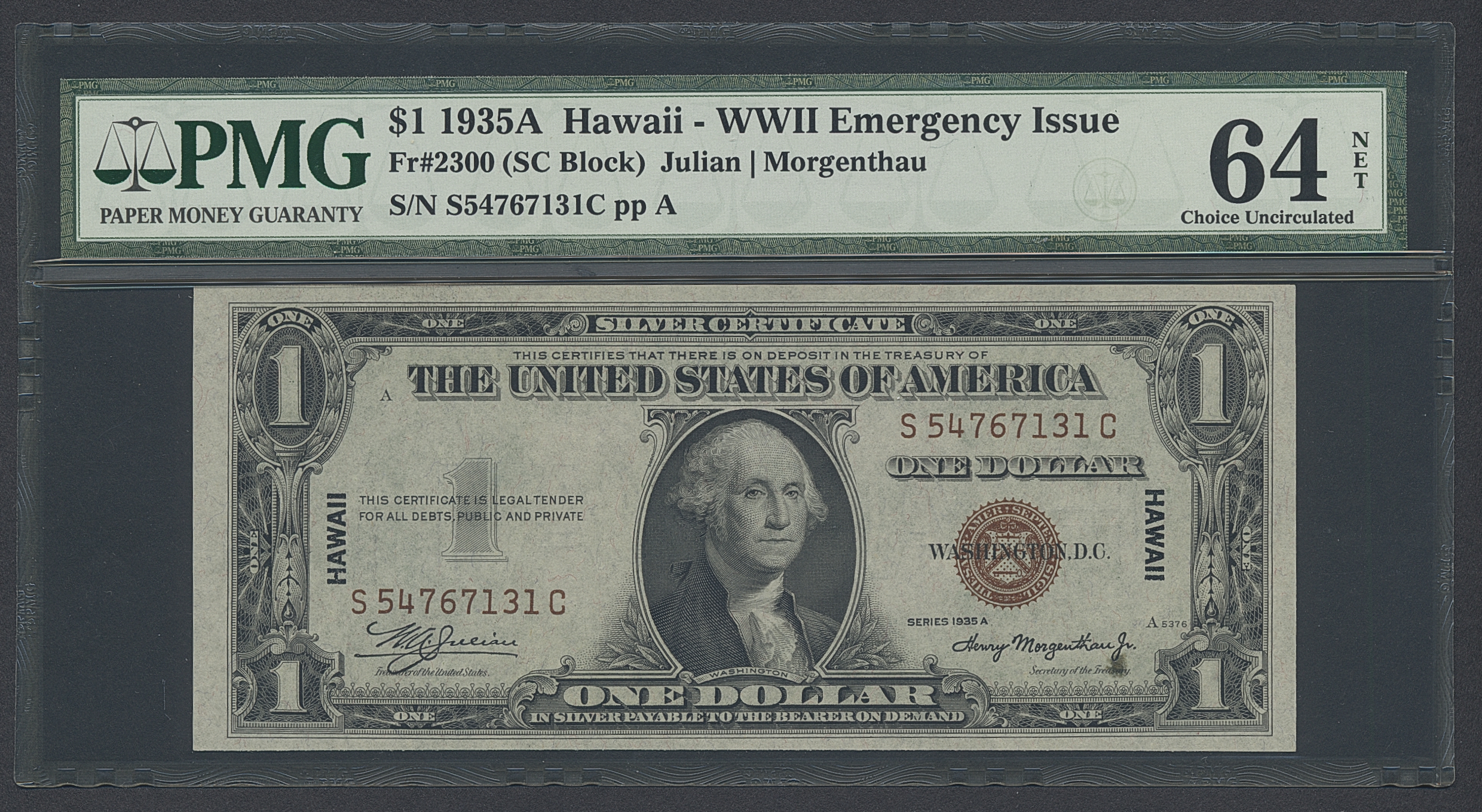 Banknotes, U.S.A. Fr 2300, 1 dollar 1935 A. S54767131C. Hawaii. Graded by PMG as uncirculated 64 NET. PMG comment is 'thinning', but according to our inspection it looks like a grease spot and not in fact thinning. We believe this would not today attract a NET grade. UNC.