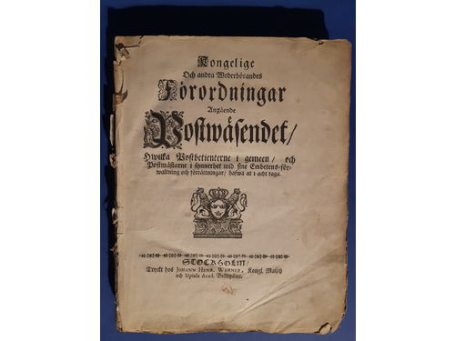 Literature. SCHMEDEMAN'S POSTAL HANDBOOK 1636–1707: 'Kongelige och andra wederbörandes förordningar angående postwäsendet ...', Stockholm, (J. H. Werner) without year (1707), 276 pp. + 'Orde-Register'. Without cover, otherwise in unusual good quality. In archive box. Very sought-after and rarely offered. Visa mindre