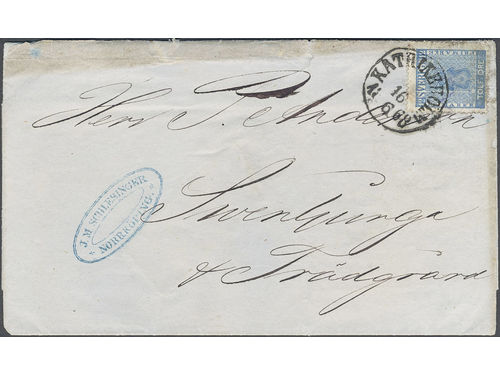 Sweden. Facit 9v6 on cover, 12 öre blue, “EXCLAMATION MARK” (Utropstecknet) variety (pos 53 in plate VI) on letter with.. Läs mer Sweden. Facit 9v6 on cover, 12 öre blue, “EXCLAMATION MARK” (Utropstecknet) variety (pos 53 in plate VI) on letter with notation "Prof." and with preserved cloth sample inside. Sent from KATRINEHOLM 16.6.1868 to Svenljunga. Some imperfections. Only a few examples of this scarce and sought-after variety on cover are recorded, as well as only a few samples are recorded from the CoA period. Ex. Michtner. Visa mindre