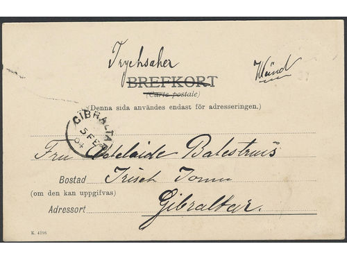 Sweden. Facit 52 on cover, 5 öre on printed matter card sent from TRELLEBORG 31.1.1904 to GIBRALTAR 5.FE.04. Scarce destination for pm mail. Sweden. Facit 52 on cover, 5 öre on printed matter card sent from TRELLEBORG 31.1.1904 to GIBRALTAR 5.FE.04. Scarce destination for pm mail. Visa mindre