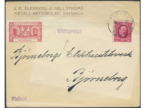 Sweden. Facit 54 on cover, 10 öre on sample of no value sent from STOCKHOLM 28.12.05 to Finland. Very scarce usage to abroad. Sweden. Facit 54 on cover, 10 öre on sample of no value sent from STOCKHOLM 28.12.05 to Finland. Very scarce usage to abroad. Visa mindre