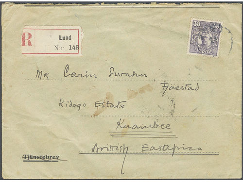 Sweden. Facit 89 on cover, 35 öre on registered cover sent from LUND 21.5.1920 to British East Africa. Arrival pmks REGI.. Läs mer Sweden. Facit 89 on cover, 35 öre on registered cover sent from LUND 21.5.1920 to British East Africa. Arrival pmks REGISTERED MOMBASA 26.JU.20, NAIROBI REGISTERED 28.1920 and KUAMBU BRIT. E. AFRICA 29.JU.20. The ONLY recorded registered mail to this scarce destination. Visa mindre