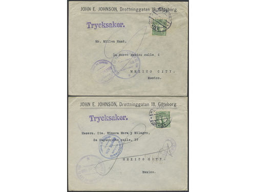 Sweden. Facit 79 on cover, 5 öre on two printed matter envelopes sent from GÖTEBORG 1915–1916 to Mexico, with arrival pm.. Läs mer Sweden. Facit 79 on cover, 5 öre on two printed matter envelopes sent from GÖTEBORG 1915–1916 to Mexico, with arrival pmks. Rare destination for pm mail. (2). Visa mindre