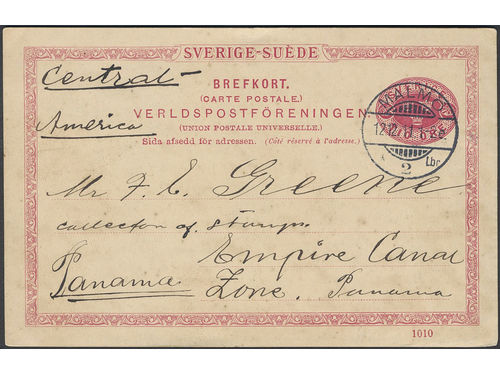 Sweden. Postal stationery, Single postcard, Facit bKe14, Postcard 10 öre sent from MALMÖ 12.12.11 to the Panama Canal Zo.. Läs mer Sweden. Postal stationery, Single postcard, Facit bKe14, Postcard 10 öre sent from MALMÖ 12.12.11 to the Panama Canal Zone. Very scarce destination. Depicted in Ferdén. Visa mindre