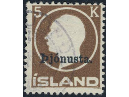 Iceland. Official Facit Tj54 used, 1922 Surcharge Þjonusta 5 Kr brown. SEK 2200 Iceland. Official Facit Tj54 used, 1922 Surcharge Þjonusta 5 Kr brown. SEK 2200 Visa mindre