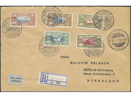 Iceland. Facit 189–93 on cover, 1930 The Parliament. Air mail SET (5). Nice cover with Thingvellir cancel on airmail cov.. Läs mer Iceland. Facit 189–93 on cover, 1930 The Parliament. Air mail SET (5). Nice cover with Thingvellir cancel on airmail cover to Berlin, Germany. SEK 3600 Visa mindre