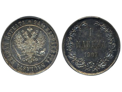 Coins, Finland. Nicholas II, KM 3.2, 1 markka 1907. Graded by PCGS as MS62. Bitkin 399. 01. See certification at PCGS Coins, Finland. Nicholas II, KM 3.2, 1 markka 1907. Graded by PCGS as MS62. Bitkin 399. 01. See certification at PCGS Visa mindre