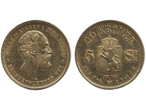 Coins, Norway. Oskar II, NM 2, 20 kroner/ 5 speciedaler 1875. 8.96 g gold. 1+. Coins, Norway. Oskar II, NM 2, 20 kroner/ 5 speciedaler 1875. 8.96 g gold. 1+. Visa mindre