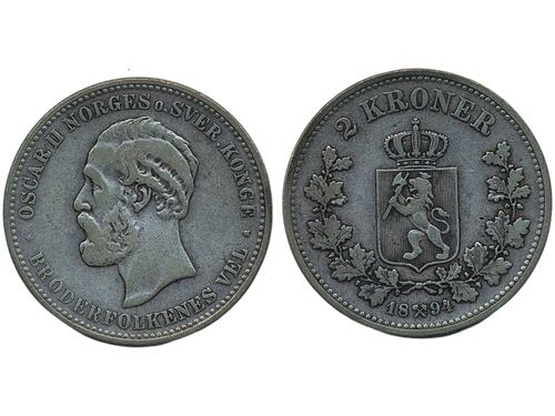Coins, Norway. Oskar II, NM 24, 2 kroner 1894. 14.79 g. 1/1+. Coins, Norway. Oskar II, NM 24, 2 kroner 1894. 14.79 g. 1/1+. Visa mindre
