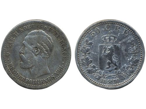 Coins, Norway. Oskar II, NM 53, 50 øre 1880. Key date. 1. Coins, Norway. Oskar II, NM 53, 50 øre 1880. Key date. 1. Visa mindre