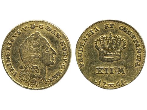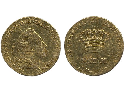 Coins, Denmark. Frederik V, Sieg 21.3, 1 kurantdukat (12 mark) 1759. 3.07 g. Scrape. 1. Coins, Denmark. Frederik V, Sieg 21.3, 1 kurantdukat (12 mark) 1759. 3.07 g. Scrape. 1. Visa mindre