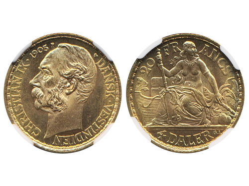 Coins, Denmark, Danish West Indies. Christian IX, KM 72, 4 daler / 20 francs 1905. Very high grade example of this more.. Läs mer Coins, Denmark, Danish West Indies. Christian IX, KM 72, 4 daler / 20 francs 1905. Very high grade example of this more scarce type. Graded by NGC as MS66. 0. See certification at NGC Visa mindre
