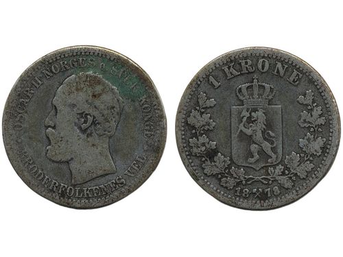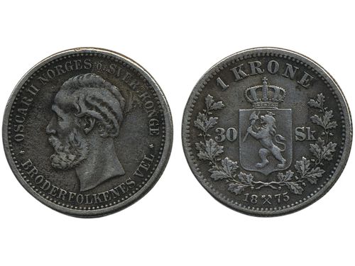 Coins, Norway. Oskar II, NM 30, 1 krone 1875. 1/1+. Coins, Norway. Oskar II, NM 30, 1 krone 1875. 1/1+. Visa mindre