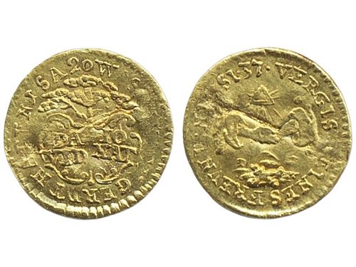 Coins, Denmark. Frederik V, Sieg 21.4 (Hede 22D), 12 mark (kurantdukat) 1761. 3.06 g. Reverse somewhat tooled. 1/1+. Coins, Denmark. Frederik V, Sieg 21.4 (Hede 22D), 12 mark (kurantdukat) 1761. 3.06 g. Reverse somewhat tooled. 1/1+. Visa mindre