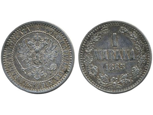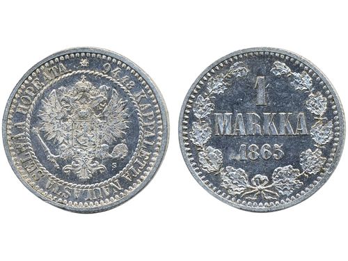 Coins, Finland. Alexander II, KM 3.1, 1 markka 1865. Beautiful example with prooflike fields. 01. Coins, Finland. Alexander II, KM 3.1, 1 markka 1865. Beautiful example with prooflike fields. 01. Visa mindre