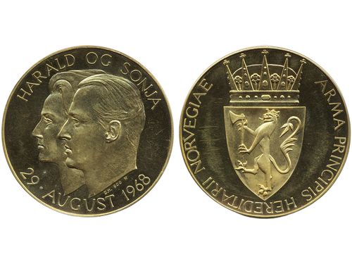 Medals, regal, Norway. 49.95 g. Gold medal (900/1000) to Royal Wedding of Harald and Sonja 29 Aug 1968, 50 mm, by Ø. Han.. Läs mer Medals, regal, Norway. 49.95 g. Gold medal (900/1000) to Royal Wedding of Harald and Sonja 29 Aug 1968, 50 mm, by Ø. Hansen. Reverse hairlines. Scarce to see this medal in large size. 01. Visa mindre