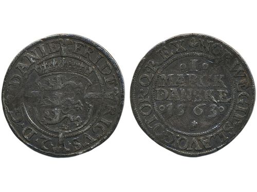 Coins, Denmark. Frederik II, Sieg 15.2 (Hede 9B), 1 mark 1563. 7.98 g. Tooled. 1. Coins, Denmark. Frederik II, Sieg 15.2 (Hede 9B), 1 mark 1563. 7.98 g. Tooled. 1. Visa mindre