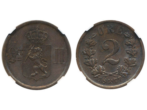 Coins, Norway. Oskar II, NM 103, 2 øre 1877. Graded by NGC as MS63 BN. 01/0. See certification at NGC Coins, Norway. Oskar II, NM 103, 2 øre 1877. Graded by NGC as MS63 BN. 01/0. See certification at NGC Visa mindre