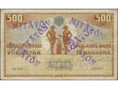 Banknotes, Finland. Pick 23, 500 markkaa 1909. cancelled (makulerad, mitätön). No: 21991(0), last digit in serial number erased. 1. Banknotes, Finland. Pick 23, 500 markkaa 1909. cancelled (makulerad, mitätön). No: 21991(0), last digit in serial number erased. 1. Visa mindre