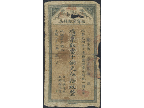 Banknotes, China - Empire. Pick S1173, 50 coppers Year 33 (1907). Very scarce note, small paper loss. Graded by PMG as V.. Läs mer Banknotes, China - Empire. Pick S1173, 50 coppers Year 33 (1907). Very scarce note, small paper loss. Graded by PMG as VG 8. Comments 'paper damage, stains . VG. Visa mindre