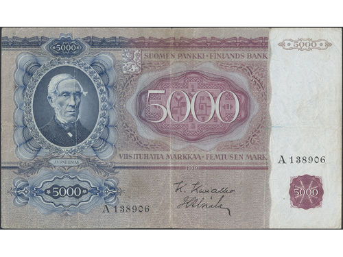 Banknotes, Finland. Pick 75a, 5000 markkaa 1939. A138906. Scarce type. 1?/1. Banknotes, Finland. Pick 75a, 5000 markkaa 1939. A138906. Scarce type. 1?/1. Visa mindre