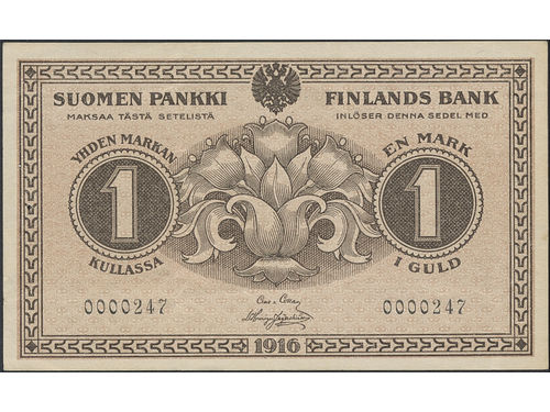Banknotes, Finland. Pick 19, 1 markka 1916. Low serial number 0000247. 01. Banknotes, Finland. Pick 19, 1 markka 1916. Low serial number 0000247. 01. Visa mindre