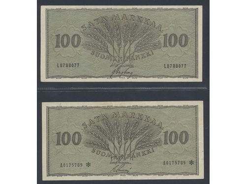 Banknotes, Finland. Pick 91a, 91r, 100 markkaa 1955. Two notes including replacement (A0175785*, 1+). The regular note w.. Läs mer Banknotes, Finland. Pick 91a, 91r, 100 markkaa 1955. Two notes including replacement (A0175785*, 1+). The regular note with serial number L8788077, 01. 1+-01. Visa mindre